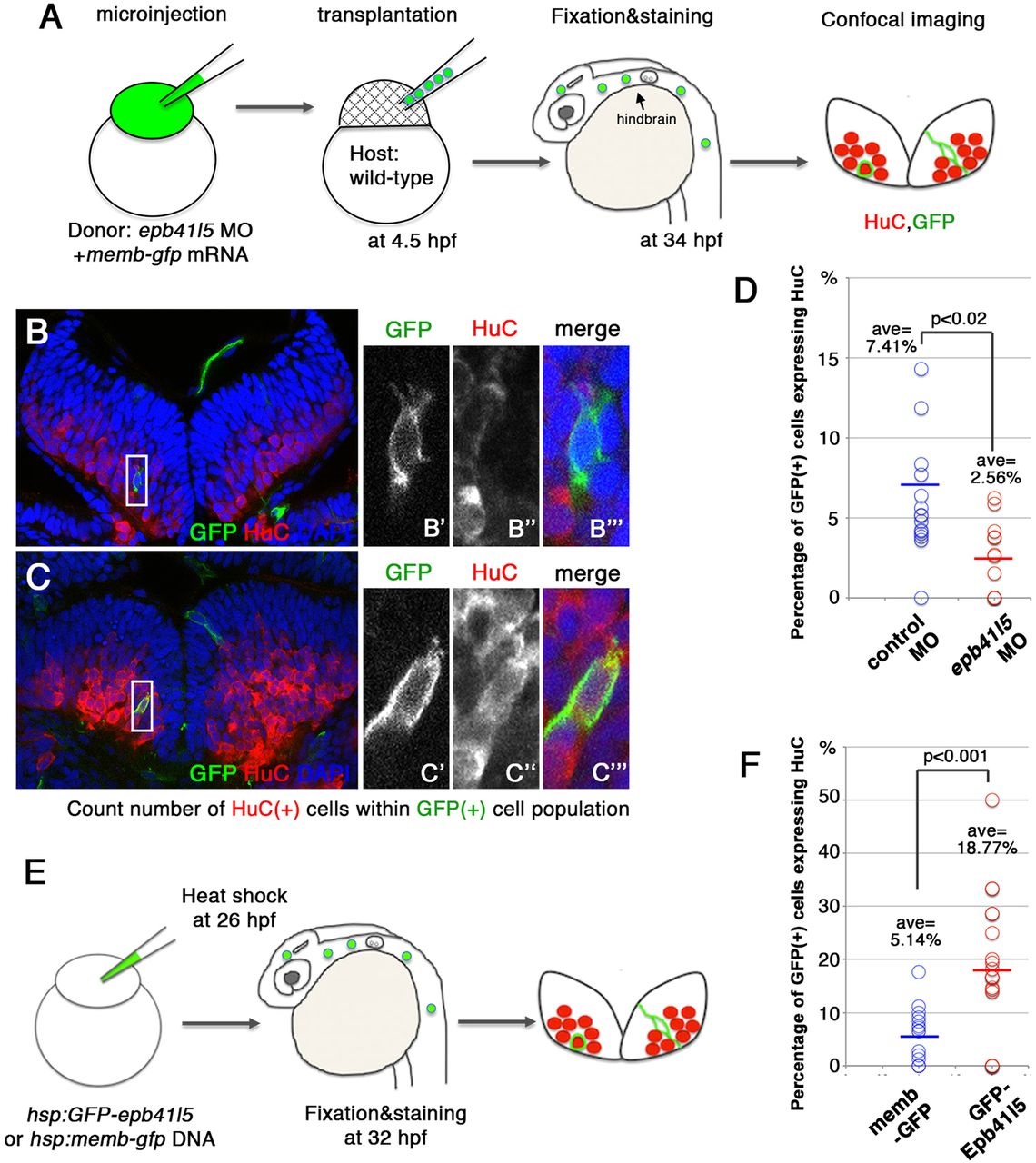 Epb41l5 facilitates differentiation of neurons. (A) Schematic of the experiment. epb41l5 morpholino was injected into one-cell-stage embryos with memb-gfp mRNA. Twenty to thirty cells were transplanted to wild-type embryos. Ratios of HuC-expressing cells within total GFP-expressing transplanted cells were analyzed in individual confocal images. (B,C) Representative images of HuC-positive neurons in the hindbrain. Boxed areas in B and C are enlarged in the right-hand panels. The cell in B does not express HuC, suggesting an undifferentiated NPC. The cell in C does express HuC, suggesting a differentiated neuron. (D) Reduced expression of epb41l5 attenuates differentiation of neurons. Out of the 428 control transplanted cells in 16 embryos that were analyzed, 7.41% cells expressed HuC. Out of the 221 epb41l5-deficient transplanted cells in 12 embryos that were analyzed, 2.56% cells expressed HuC. ave, average. (E) Schematic of the experiment. Plasmid DNAs encoding membGFP or GFP-Epb41l5 were microinjected. At 6h after heat-shock treatment, HuC expression in GFP-expressing cells was analyzed at 32hpf. (F) GFP-Epb41l5 facilitated differentiation of neurons. Out of the 623 membGFP-expressing cells in eight embryos that were analyzed, 5.14% cells expressed HuC. Out of the 277 cells overexpressing GFP-Epb41l5 in six embryos that were analyzed, 18.77% cells expressed HuC.