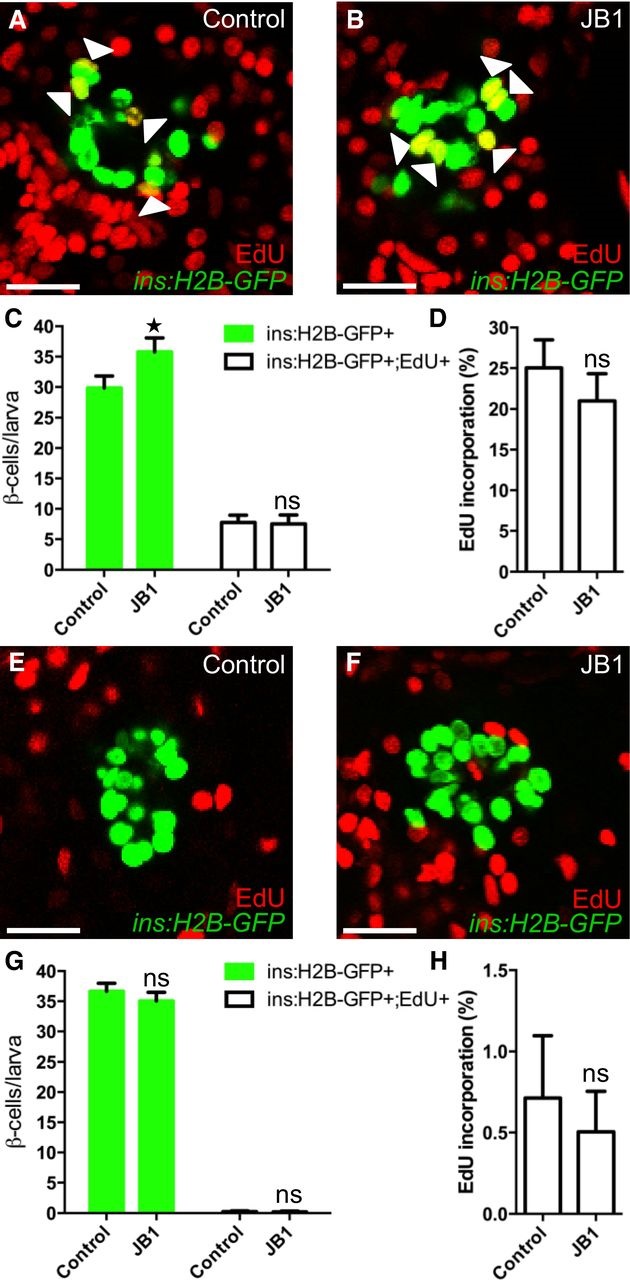 A-D. Tg(ins:H2BGFP);Tg(ins:FlagNTR) larvae were treated with MTZ from 3 to 4 dpf to ablate the β cells. DMSO or JB1 was then injected into the larval pericardial cavity at 4 dpf, and the larvae were treated with EdU from 4 to 6 dpf. Representative confocal images (A, B) at 6 dpf of DMSO and JB1injected larvae, showing β cells in green and the β cells that incorporated EdU as yellow (green and red overlap; see arrowheads). Scale bars: 20 µm. (C) Quantification of the number of all β cells (green bars) and of β cells that incorporated EdU (white bars) per larva at 6 dpf. *P = 0.0422; ns=nonsignificant (P = 0.9944). (D) Rate of βcell proliferation, shown as the percentage of β cells that incorporated EdU. ns=nonsignificant (P = 0.5885). n = 12 larvae in the DMSOinjected group; n = 19 larvae in the JB1injected group.
