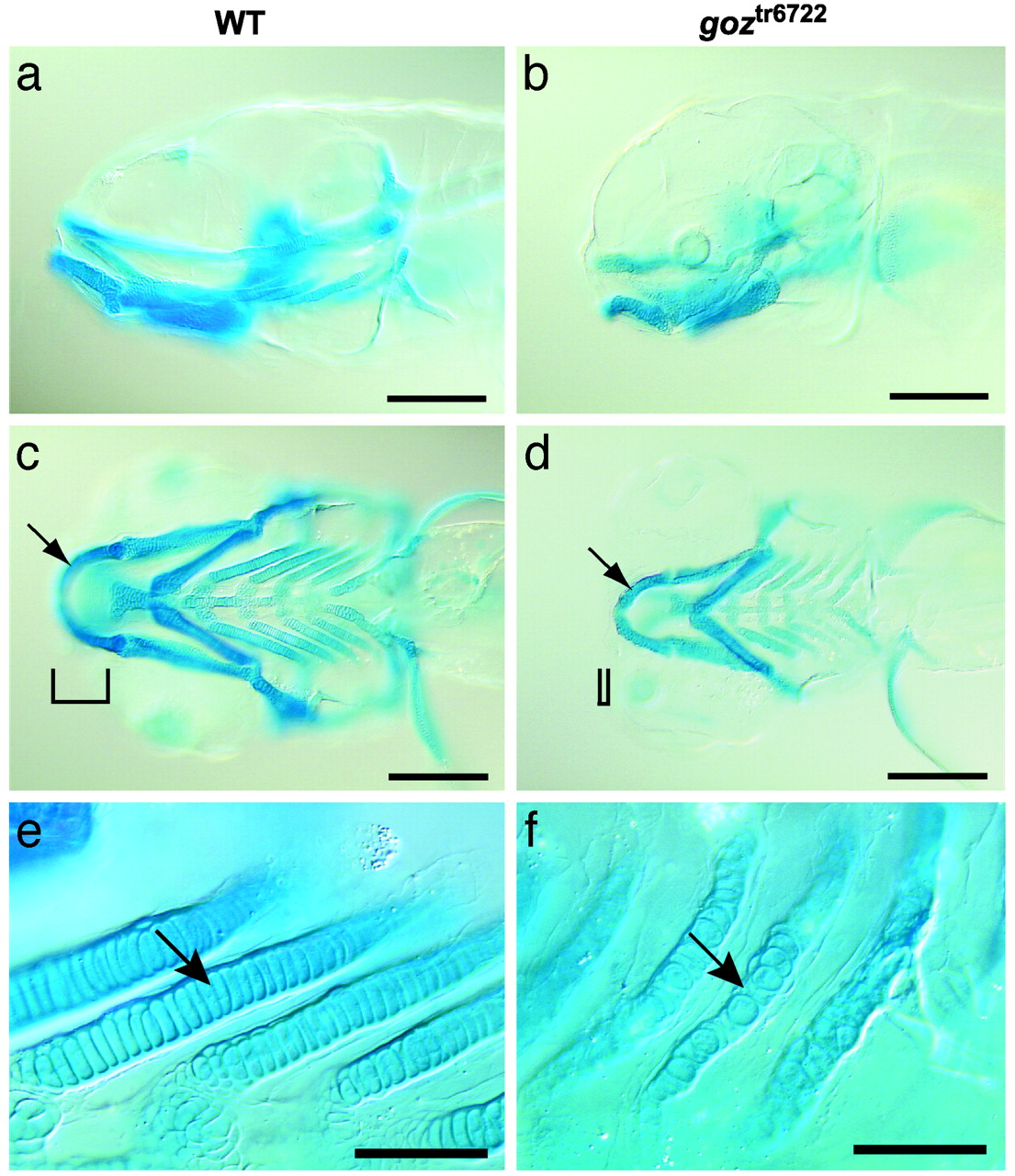 Cartilage defects in goz. Alcian blue staining of sibling larvae (a, c, and e) and goz larvae (b, d, and f) at 5 dpf is shown. (a and b) Lateral view. (c and d) Ventral view of the head. (e and f) Enlargement of the branchial arches. Cartilage matrix staining is slightly reduced in goz mutants. All cartilage elements, including Meckel′s cartilage (arrows in c and d), are smaller in the mutant. Tissue anterior to the eyes is missing (bars in c and d). The columnar arrangement of chondrocytes in the branchial arches is disrupted in goz mutants (arrows in e and f). (Scale bars are 200 µmin a-d and 50 µmin e and f.)