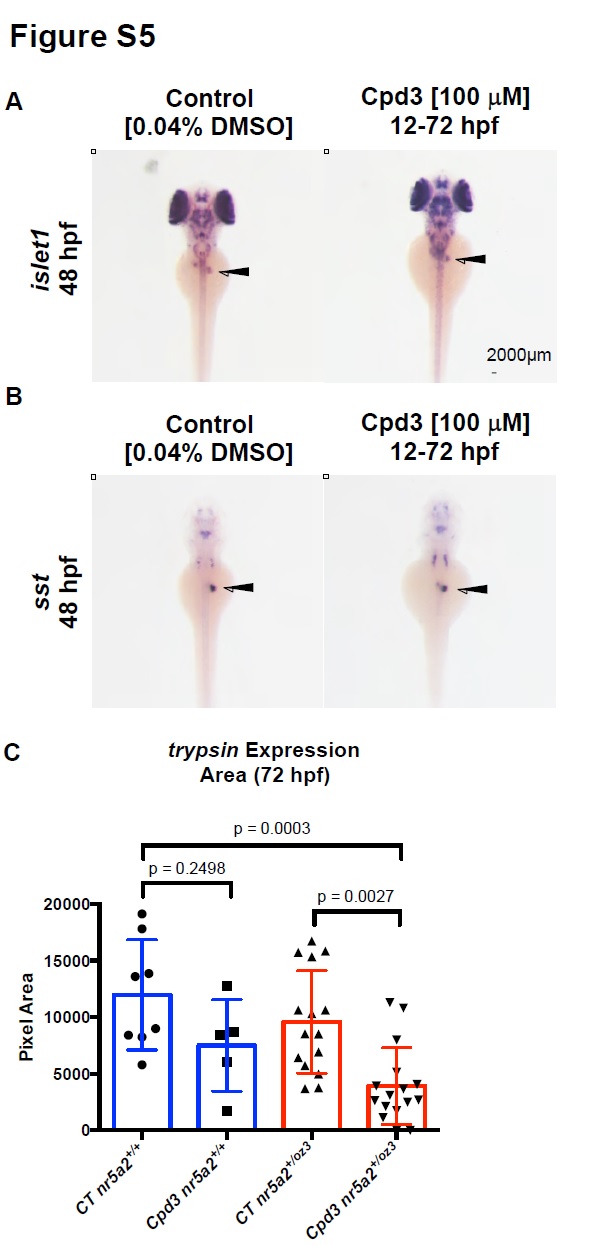 Effects of Cpd3 exposure on pancreas development. A) Endocrine pancreas cells (black arrows) expressing islet1 are present by in situ hybridization in embryos treated with Cpd3 from 12 - 72 hpf. B) δ-cells expressing somatostatin (sst) (black arrows) are present by in situ hybridization in embryos treated with Cpd3 from 12 - 72 hpf. C) Quantification of exocrine pancreas size by area of trypsin expression at 72 hpf. 200 µM Cpd3 treatment elicits a robust reduction in pancreas size in heterozygote nr5a2+/oz3 embryos relative to control nr5a2+/oz3 siblings and control nr5a2+/+ embryos. (n > 5 per group; for control nr5a2+/+ vs. Cpd3 treated nr5a2+/+, p = 0.2498; for control nr5a2+/oz3 vs Cpd3 treated nr5a2+/oz3, p = 0.0027; for control nr5a2+/+ vs. Cpd3 treated nr5a2+/oz3, p = 0.0003; ordinary one-way ANOVA with Tukey’s multiple comparisons test).