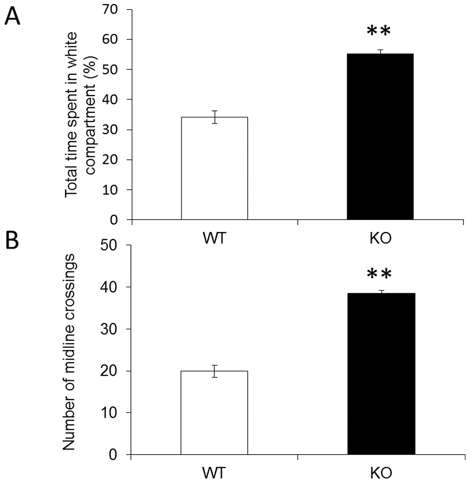 (A) Bar graphs of the time spent in the white compartment by fmr1 KO and wild-type fish. **p<0.01 compared with wild-type fish. (B) Bar graph of the number of midline crossings for fmr1 KO (n = 12) and wild-type fish (n = 10). **p<0.01 compared with wild-type fish.