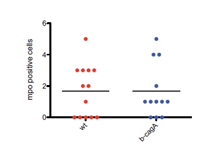 CagA expression does not result in increased inflammation. Myeloperoxidase (mpo)-positive neutrophils present in the intestine at 8 dpf.