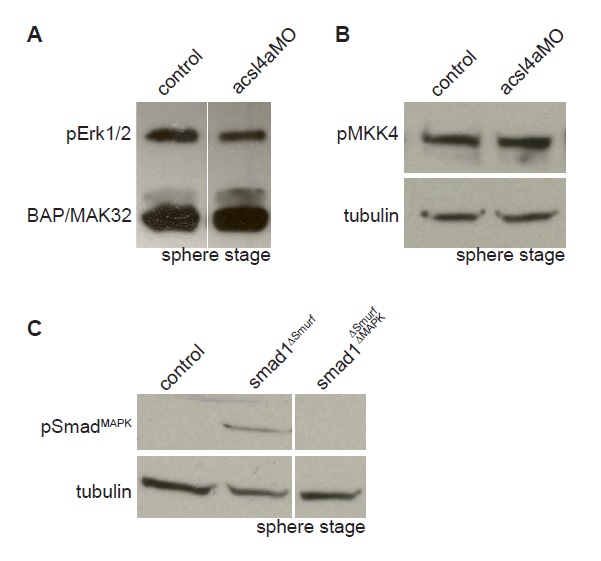 (A) Erk1/2 is not activated in acsl4a morphants. Representative western blot of phosphorylated Erk1/2 from control embryos and embryos injected with acsl4a MO (500 fmol) at sphere stage. Anti-BAP/MAK32 is shown as a loading control. An extraneous lane is omitted. pERK1/2 levels in acsl4a MO-injected embryos are 90±19% of control (not significant, n=3). (B) Jnk signaling cascade is not activated in acsl4a morphants. Representative western blot of phosphorylated MKK4 from control embryos and embryos injected with acsl4a MO (750 fmol) at sphere stage. Blots were stripped and probed with alpha-tubulin as a loading control. pMKK4 levels in acsl4a MO-injected embryos are 1.57 ± .82% of control (not significant, n=4). (C) Representative western blot (n=3) testing the antibody against MAPK phosphorylated hSmad1 (pSmad”MAPK) (gift of Eddie de Robertis (Fuentealba et al., 2007)) on zebrafish Smad constructs (1 ng). An extraneous lane between smad1”Smurf and smad1”Smurf”MAPK is omitted.
