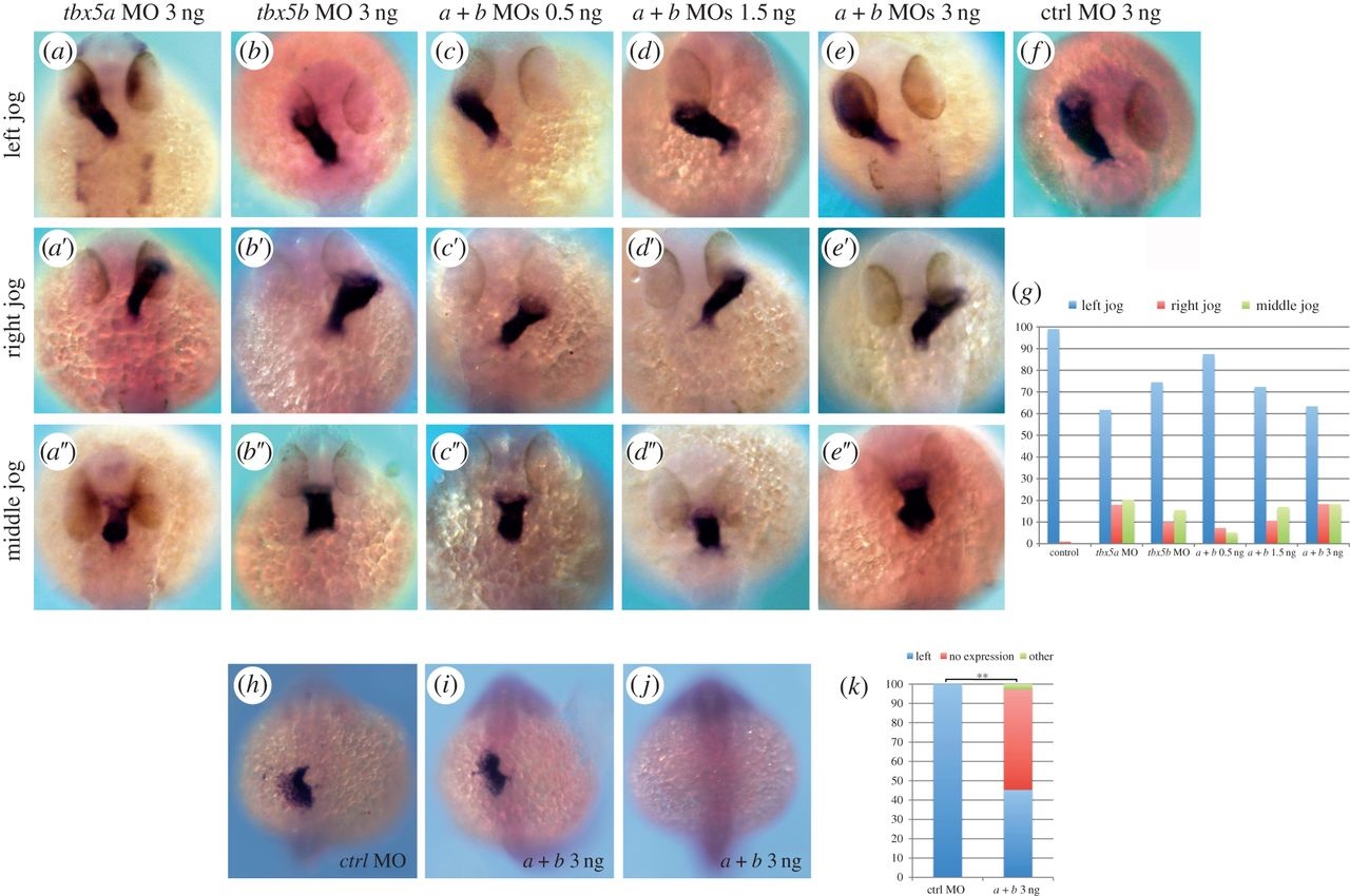 tbx5 morphants exhibit cardiac jogging and lefty2 expression defects. (a-a′′) tbx5a morphant phenotypes. (b-b′′) tbx5b morphants. (c-e′′) Left, right and middle jog phenotypes obtained by co-injection of tbx5a and tbx5b MOs at 0.5 ng (c-c′′), 1.5 ng (d-d′′) or 3 ng (e-e′′) of each MO. (f) Control (ctrl) morphant. (g) Quantification of the phenotypes. (h-j) lefty2 expression in control (h) and double-morphant (i,j) 22-somite stage embryos. (k) Quantification of the phenotypes. A χ2 test has been used to assess significant differences between groups (**p < 0.001). All images are dorsal views with anterior to the top, and myl7 expression is used to highlight the developing heart tube in a-f.