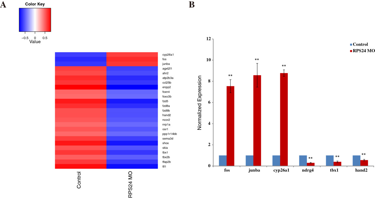 Differentially expressed hematological genes in RPS24 MO. (A) A total of 25 differentially expressed hematological genes (by fold-change >1.3 and p-value <0.05) were detected in RPS24-deficient zebrafish embryos in 48hpf. The expression intensity of these genes were normalized to (-1, 1) and represented as heat map by R script. (B) Representative experimental validation of the regulated genes by Real-time PCR analysis. Gene expression was represented as the mean ± SD and One-way ANOVA was performed for comparison between Control and RPS24-deficient zebrafish embryos (**P <0.001, *P <0.01, n = 3). Gene expression in Control samples was normalized to 1.