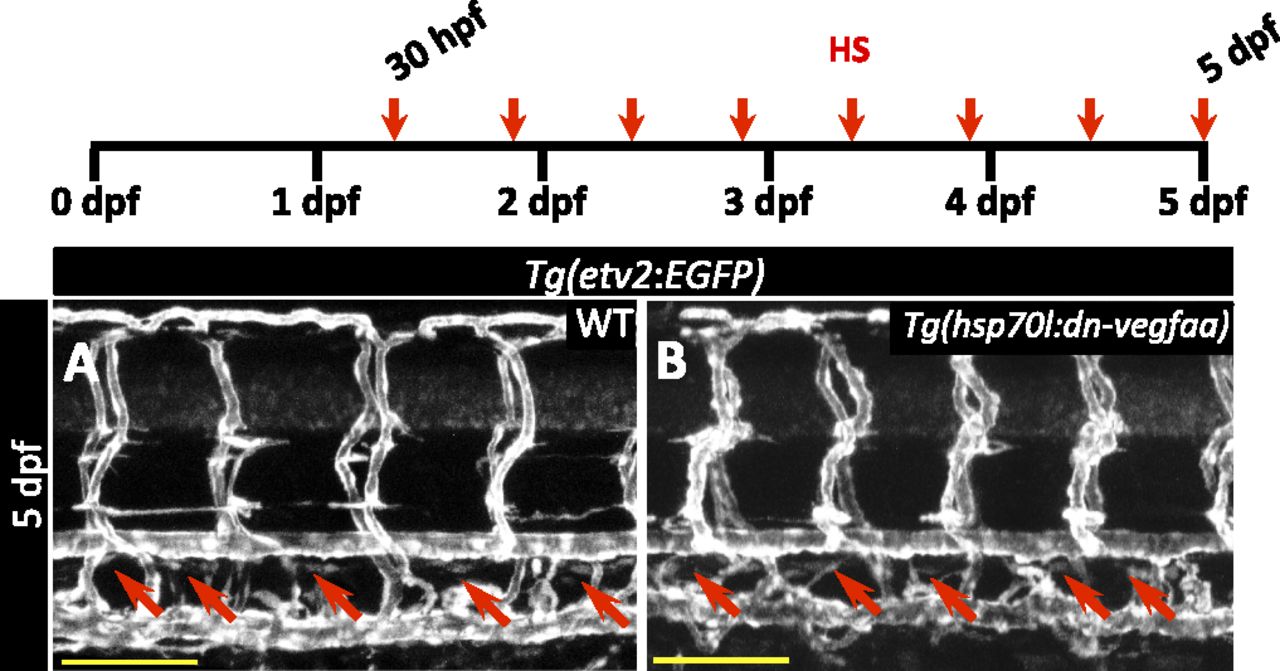 dn-vegfaa does not affect thoracic duct formation. (A and B) Confocal images of the trunk vasculature in 5 dpf Tg(etv2:EGFP) WT (A) and Tg(hsp70l:dn-vegfaa);Tg(etv2:EGFP) (B) larvae heatshocked from 30 hpf every 12 h until 5 dpf. Red arrows point to thoracic duct. (Scale bars: 100 µm.)