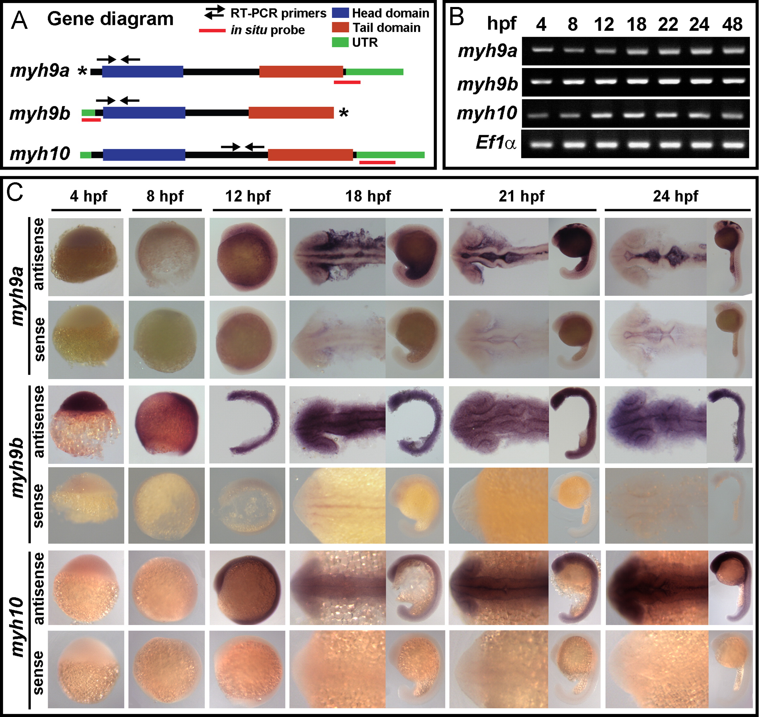 myh9a, myh9b, and myh10 are expressed during the time of MHB morphogenesis. (A) Diagram of the zebrafish myh9a, myh9b, and myh10 genes. Domain regions are highlighted. Regions amplified for RT-PCR time course expression are shown with arrows (primer details can be found in “Materials and Methods”). Asterisks indicate the regions of the full length myh9a and myh9b in the current Ensembl zebrafish genome that have not been completely annotated. (B) RT-PCR analysis of myh9a, myh9b, and myh10 over a time course of embryonic development spanning MHB morphogenesis. EF1α was used as a control. Primer locations are indicated in panel A. (C) Time course of gene expression by in situ hybridization for myh9a, myh9b, and myh10 in the developing embryo from 4 hpf–24 hpf. Each gene is shown with the antisense probe expression pattern and sense control.