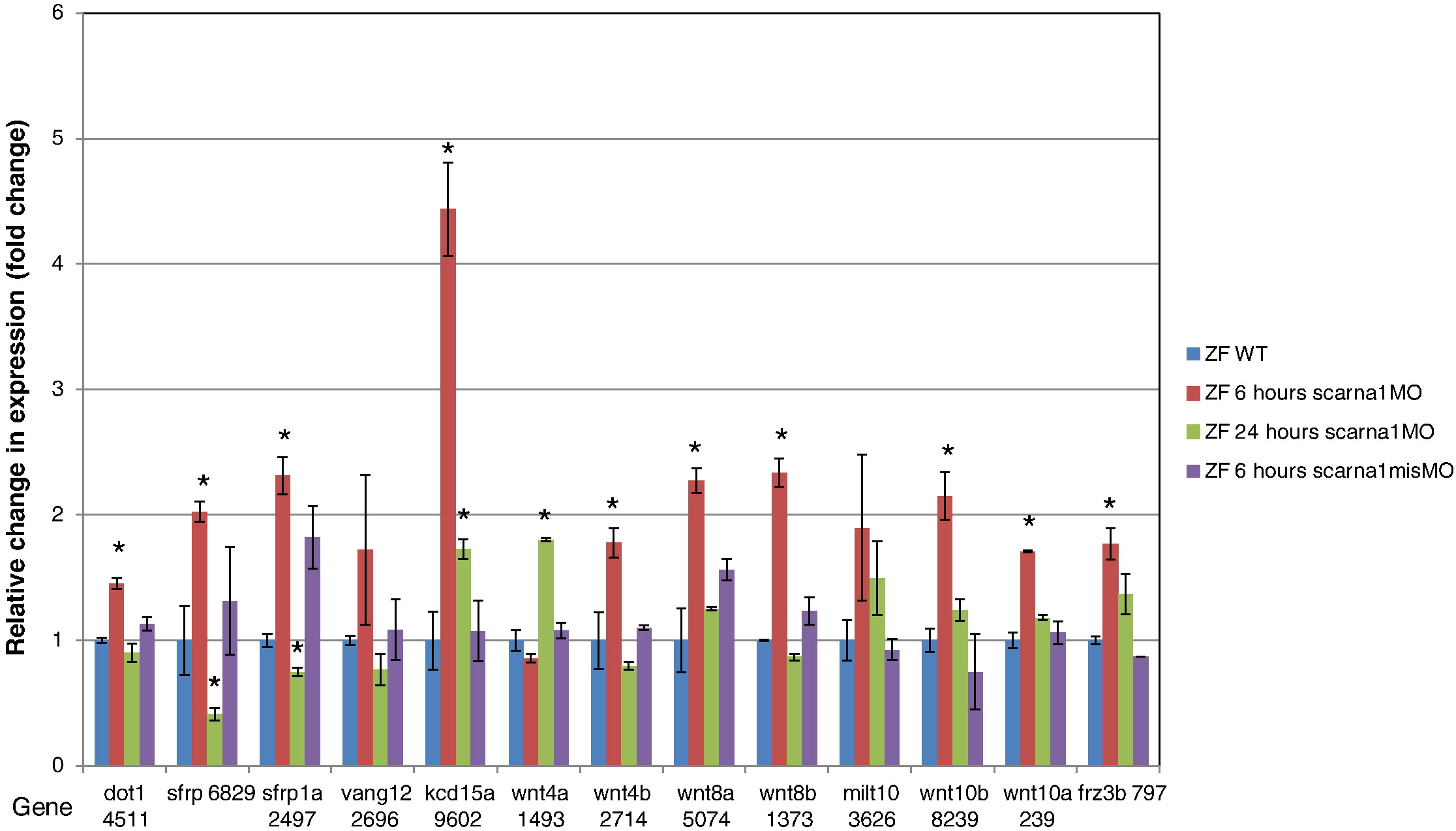 Splice isoform changes after targeting scarna1. Treating zebrafish embryos with anti-scarna1 morpholino causes changes in exon retention of cardiac regulatory genes. 13 of 39 members of the Wnt family have significant changes in exon retention after treatment with antisense morpholino (assessed by RNA-Seq and qRT-PCR, values shown are from qRT-PCR data quantifying the variable exon). The misMO oligo is a negative control that differs from the primary morpholino by 5 nucleotides in the critical binding site. The gene name is shown on the horizontal axis and the numbers represent the start position of the exon. *Significantly different from the WT, p < 0.05.