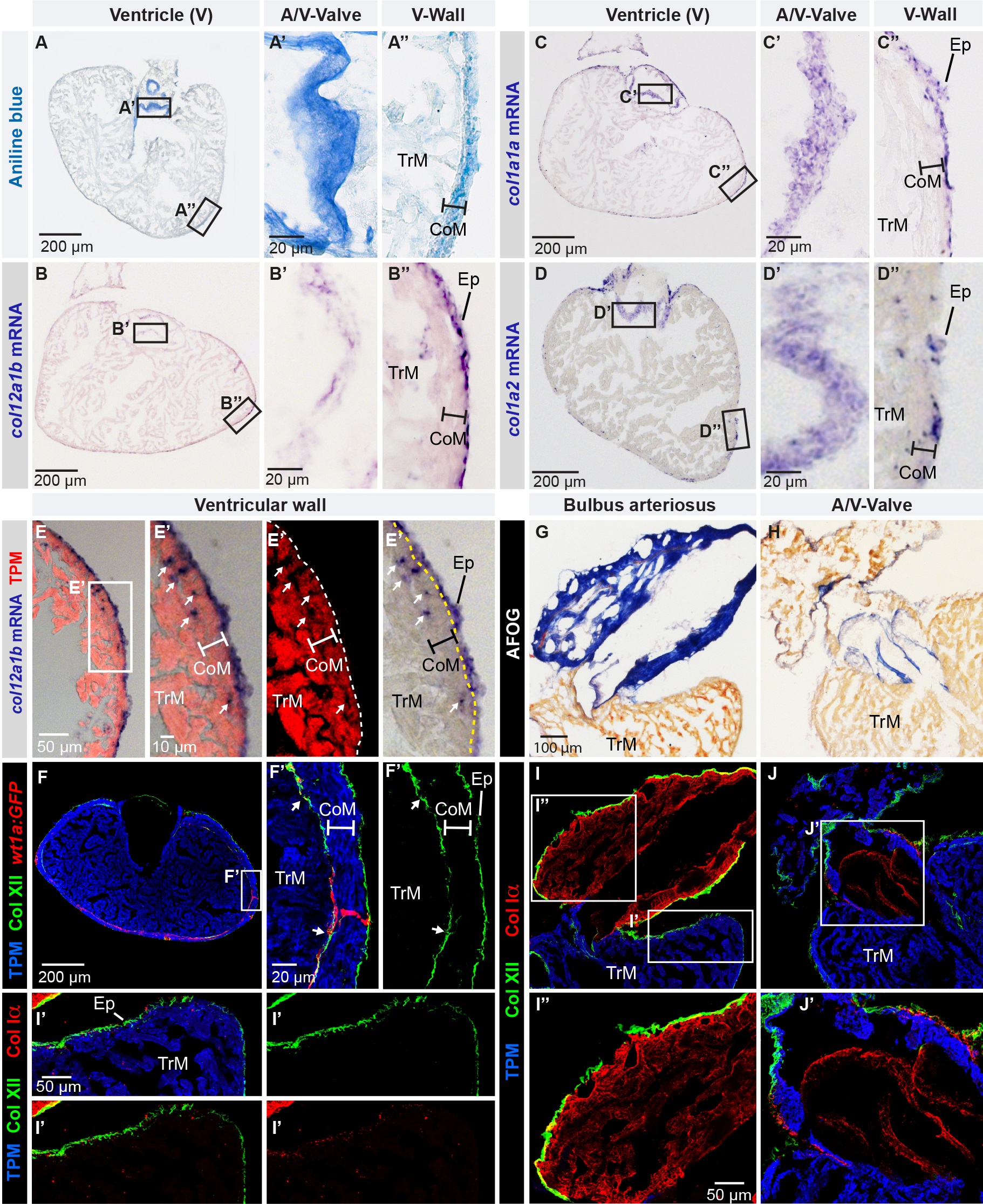 (A) Aniline blue staining of a ventricle transversal section visualizes collagen (blue). Framed areas encompass parts with the atrio-ventricular valve (A/V-Valve) and ventricular wall (V-Wall). The thickness of the compact myocardial layer is depicted as a bar in this and subsequent panels. Ep, epicardium; CoM, compact myocardium; TrM, trabecular myocardium. N = 5. (B-D) In -situ hybridization of ventricle sections detected by a color reaction (purple). Probe names are to the left. Framed areas encompass the parts that are enlarged in the panels to the right. N ≥ 4. (E) Superposition of a bright-field image with in -situ hybridization using col12a1b probe (purple) and fluorescent immunodetection of muscle protein Tropomyosin, TPM (red). col12a1b is expressed in the epicardium that is located externally from the myocardial border (dashed line). A few col12a1b-expressing cells are Tropomyosin-negative (arrows) and are interspersed within the compact myocardium (the thickness of the compact myocardium is indicated with a white bar). N = 4. (F) Immunofluorescence with anti-Tropomyosin (blue) to label cardiomyocytes and anti-Col XII (green) of transgenic fish wt1a(-6.8kb):GFP (red), which labels cardiac subepicardial fibroblasts (white arrows) located mainly along the junction between the outer compact myocardium (white bar) and inner trabecular myocardium. N = 4. (G, H) Aniline blue, acid Fuchsin, Orange G (AFOG) staining detects collagen (blue) in bulbus arteriosus (G, longitudinal heart section) and the leaflets of the atrioventricular valve (H, transversal heart section). N = 6. (I, J) Triple immunofluorescence staining against Col XII (green), Col Iα (red) and Tropomyosin (blue) of the structures shown in above panels. (I’) Col XII is detected on the myocardial surface. (I”) In the bulbus arteriosus, Col Iα fibers are in the interstitium, while Col XII is restricted to its surface. (J’) The atrio-ventricular connection displays Col Iα, but little Col XII in the valve leaflets. N = 6. (A’, B’, C’, D’, E’, F’) Higher magnifications of the framed areas shown in images that are labeled with the same letter without prime symbol. The same rule applies to all subsequent figures.
