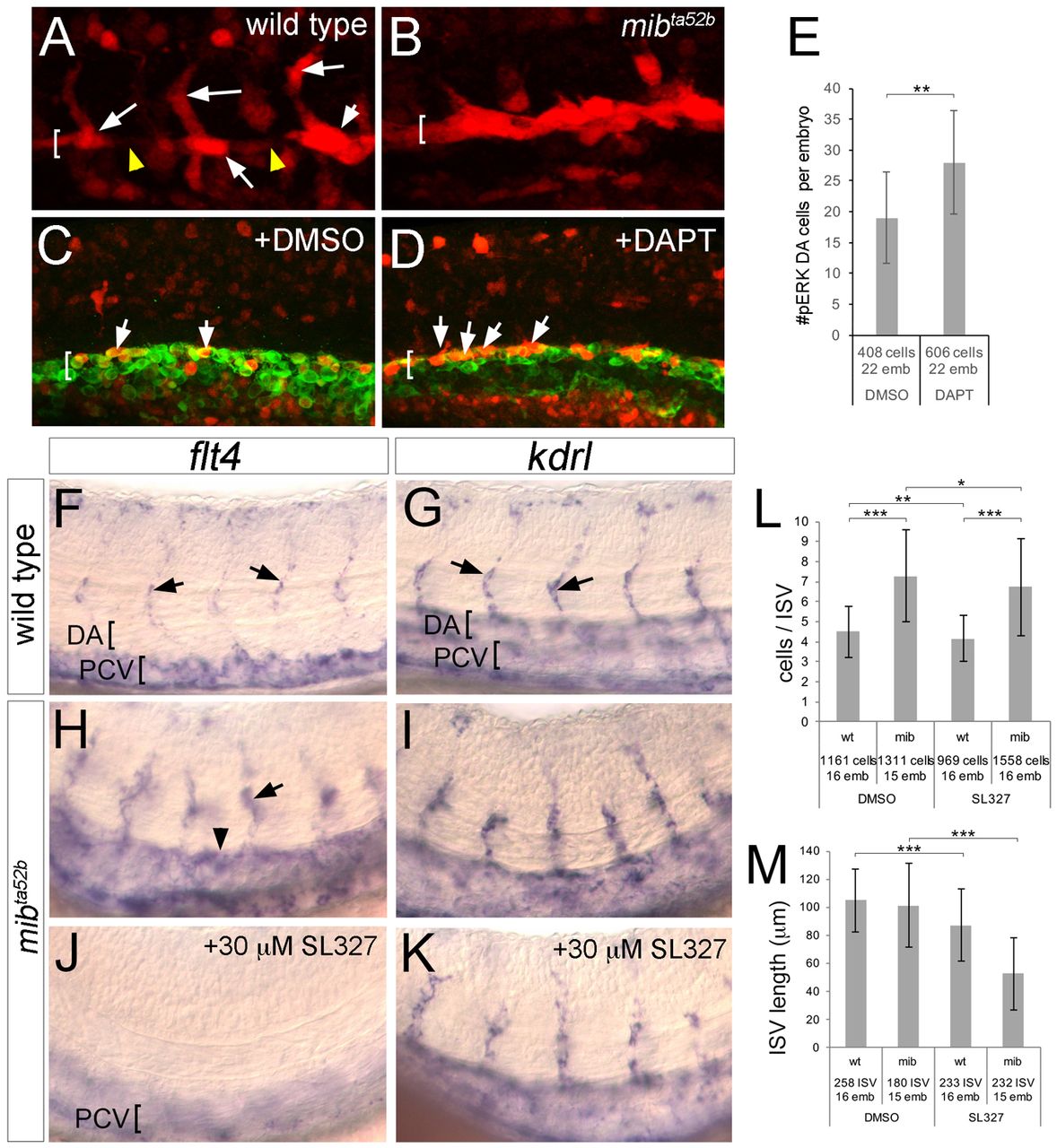 Ectopic ERK activation in Notch-deficient embryos induces flt4 and the hyper-angiogenic phenotype. (A,B) Embryos of the indicated genotype at 21 hpf immunostained for pERK (red). (C,D) Tg(fli1a:egfp)y1 embryos immunostained for GFP (green) and pERK (red) at 20 hpf following treatment with the indicated compound from 14 hpf. In A-D, DA is indicated by bracket; arrows denote pERK-positive cells; arrowheads indicate pERK-negative DA cells. (E) Quantification of pERK-positive DA endothelial cells following treatment with DMSO or 100 µM DAPT. (F-K) Whole-mount in situ hybridization with riboprobes against the indicated transcript (top). Arrows denote ISVs; arrowhead shows ectopic DA expression in H. DA and PCV are indicated by brackets. Genotype is noted on the left, chemical treatments are indicated in respective panels. Embryos in J,K were treated with 30 µM SL327 from 25 to 29 hpf. (L,M) Quantification of endothelial cell number per ISV (L) and ISV length (M) in embryos of the indicated genotype and after chemical treatment as indicated. Embryos were treated with 15 µM SL327 from 20 to 34 hpf. (E,L,M) Numbers of cells and embryos used for analysis are shown. Error bars are ±s.d.; *P<0.05, **P<0.01, ***P<0.001.