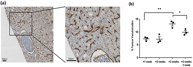 a. Representative IHC mCherry staining showing vessels (brown) from three week tumour induced adult TraNac Tg (KDR:mCherry:Fabp10-rtTA:TRE-eGFPKRASV12) zebrafish. Scale bar 50μm. b. Graph showing IHC mCherry quantitative analysis of percent vessel coverage over regions of interest. Each group (n =3) and error bars represent the SEM. *p<0.05, **p<0.01 as indicated by lines.