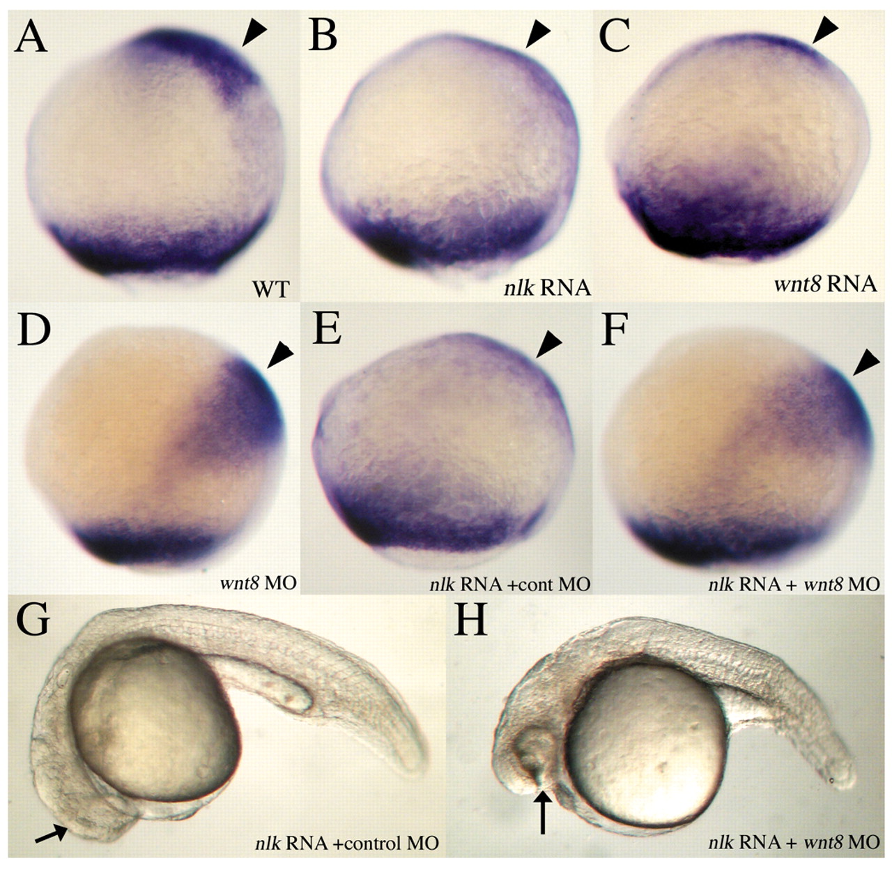 nlk RNA represses anterior neural fate in a wnt8-dependent manner. (A-F) 90-95% epiboly, lateral view, dorsal to the right. Embryos are stained with a mix of opl and tbx6 probes. Injection of 200 pg nlk RNA (B) or 10 pg wnt8 RNA (C) represses expression of opl (arrowheads) in the prospective telencephalon, compared with wild type (A). Injection of 1 ng each of wnt8 ORF1 and ORF2 morpholinos (MOs) causes a posterior shift of opl expression towards the margin (D, arrowhead). Co-injection of a control MO with nlk RNA has no effect on opl (E), whereas injection of wnt8 MOs restores opl expression when co-injected with nlk RNA (F). (G,H) Twenty-four-hour embryos, lateral view, showing rescue of eyes in nlk RNA + wnt8 MOs (G) versus nlk RNA + control MO (H).