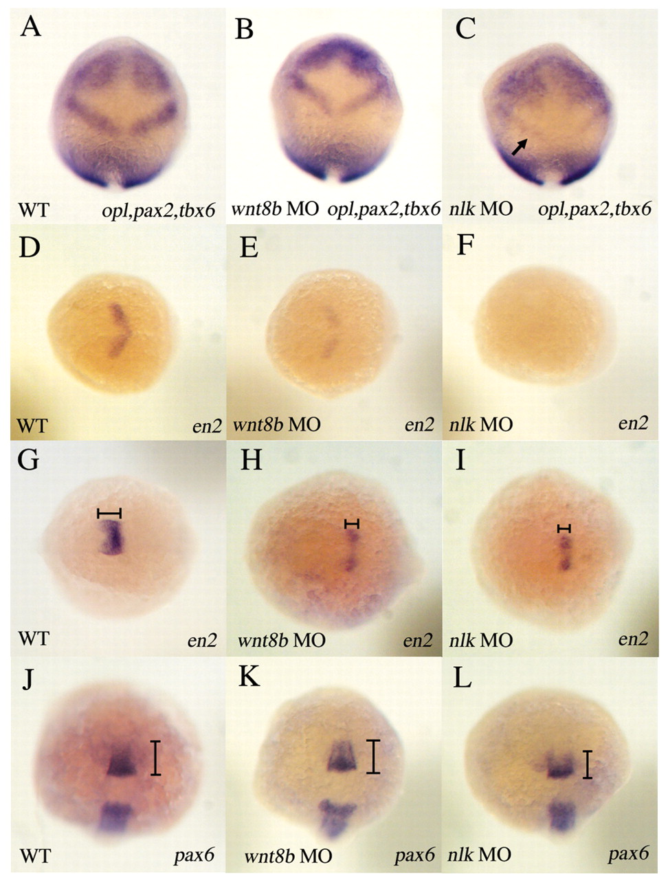 nlk MO affects expression of MHB and diencephalon markers. Embryos were injected with nlk or wnt8b MOs. At bud stage, embryos were stained with either a mix of opl, pax2 and tbx6 (A,B,C; dorsal view, anterior to top), or with en2 (D,E,F; dorsal view, anterior to left). At 7 somites, embryos were stained with either en2 (G,H,I; dorsal view, anterior to left) or pax6 (J,K,L; dorsal view, anterior to top). Although expression of opl and pax2 are unaffected in wnt8b morphants (B) compared with wild type (A), nlk morphants have a slight reduction in pax2 expression (C; arrow). en2 expression is reduced in wnt8b MO (E), and is eliminated in nlk MO (F) compared with wild type (D). At 7 somites, en2 is expressed in the MHB and midbrain (G). Expression is substantially reduced in both wnt8b and nlk morphants (H,I; brackets delineate expression domain). pax6 expression is unchanged in wnt8b MO (K), but is reduced slightly in nlk MO (L; brackets indicate AP extent of expression domain).