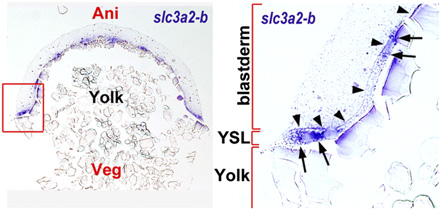Zebrafish slc3a2 is expressed specifically in the yolk syncytial layer (YSL). Shown is a section of 50% epiboly-stage embryo stained by whole-mount in situ hybridization using the slc3a2-b probe. (Left) Vertical section of the whole embryo. (Right) Enlarged view of the section of the blastoderm rim outlined in the left panel. slc3a2-b expression is restricted at the YSL (arrowheads indicate the border between the blastoderm and the YSL) and accumulates around the yolk syncytial nuclei (YSN) (indicated by arrows).