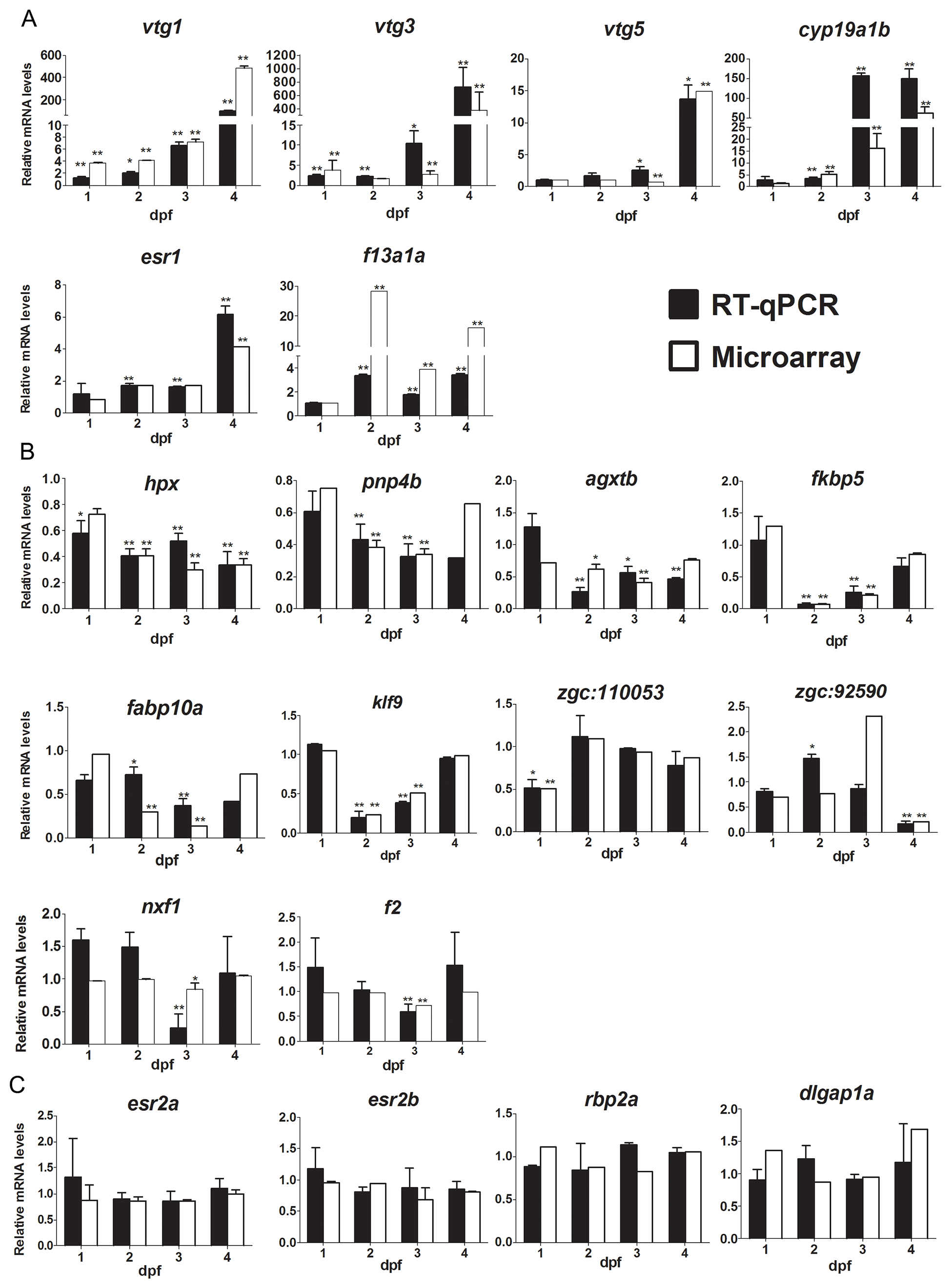 (A) Relative mRNA expression of the up-regulated genes vtg1, vtg3, vtg5, esr1, cyp19a1b and f13a1a at different time points as determined by RT-qPCR and microarray analysis. (B) Relative mRNA expression of the down-regulated genes hpx, fkbp5, fabp10a, agxtb, pnp4b, nlf1, f2, klf9, zgc: 92590 and zgc: 110053 at different time points as determined by RT-qPCR and microarray analysis. (C) Relative mRNA expression of the non-changed genes esr2a, esr2b, rbp2a and dlgap1a at different time points as determined by RT-qPCR and microarray analysis. White bars represent microarray results and black bars RT-qPCR results. Asterisk denotes significant difference (*P<0.05, **P<0.01; unpaired Student’s t-test compared to the controls), n≥3 biological replicates except for genes fabp10a, agxtb and zgc:110053 which were 2 biological replicates ; each replicate consists of 30 pooled embryos. Abbreviations vtg1: vitellogenin 1; vtg3: vitellogenin 3; vtg5: vitellogenin 5; esr1: estrogen receptor 1; esr2a: estrogen receptor 2a; esr2b: estrogen receptor 2b; cyp19a1b: cytochrome P450, family 19, subfamily A, polypeptide 1b; f13a1a: coagulation factor XIII, A1 polypeptide a, tandem duplicate 1; hpx: hemopexin; fkbp5: FK506 binding protein 5; fabp10a: fatty acid binding protein 10a; agxtb: alanine-glyoxylate aminotransferase b; pnp4b: purine nucleoside phosphorylase 4b; nxf1: nuclear RNA export factor 1; klf9: krueppel-like factor 9; f2: coagulation factor II (thrombin); rbp2a: retinol binding protein 2a and dlgap1a: discs, large (Drosophila) homolog-associated protein 1a.