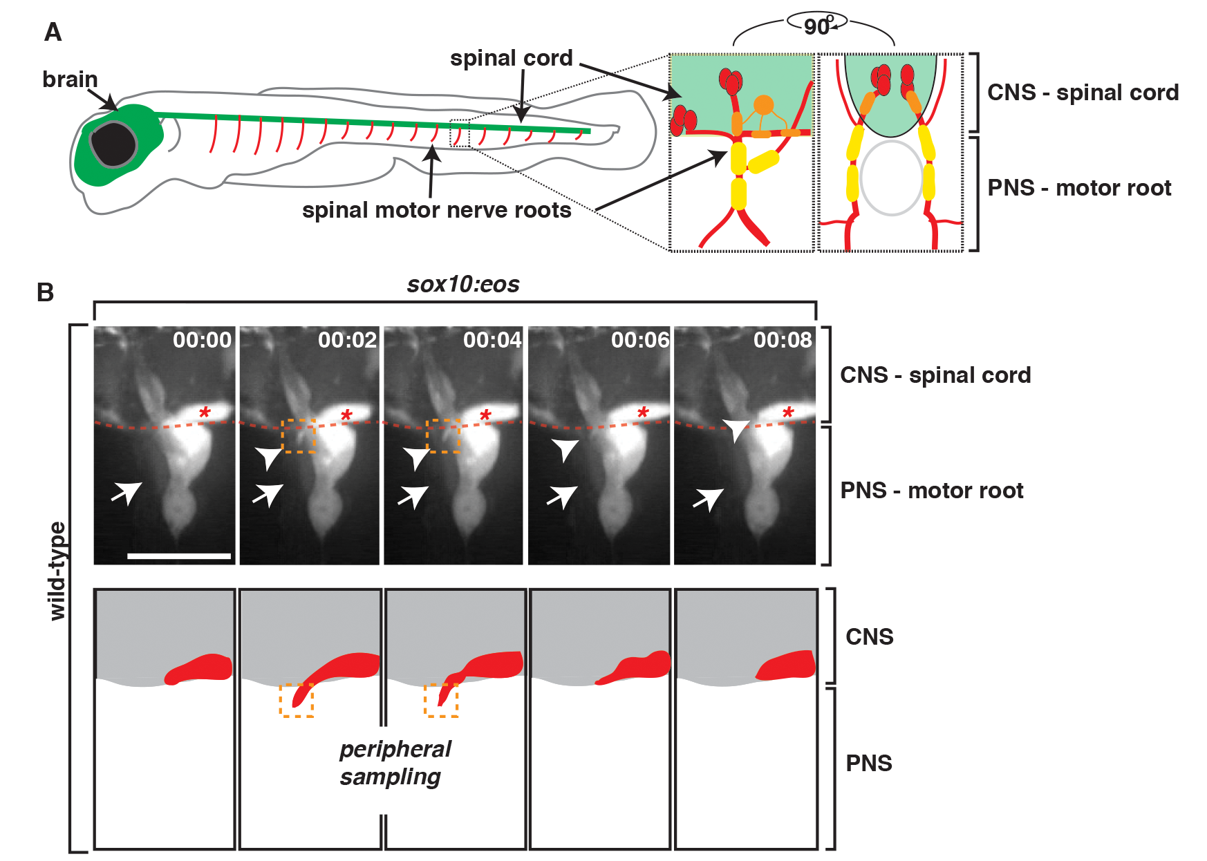 (A) Schematic of zebrafish spinal motor roots showing the CNS (green) consisting of the spinal cord and brain and the PNS (red). Insets show zoomed representations of a single spinal motor nerve root with motor axons (red), OPCs (orange), and PNS glia (yellow). Lateral and cross-section views are shown. (B) Frames captured from a 14-h time-lapse video beginning at 58 hpf in a Tg(sox10:eos) embryo. Numbers in upper right corners denote time lapsed from the first frame of the figure. (A) At approximately 68 hpf (00:00), peripheral glial cells (arrow) and OPCs (asterisk) can be seen. Just 2 min later (00:02), an OPC process (arrowhead/orange box) extended out of the spinal cord, contacted the motor root glial cell (arrow), and quickly retracted, all within 6 min. Traced schematic below shows spinal cord (grey) and OPC (red), at the corresponding times. All images are lateral views of the motor and sensory root with dorsal to the top and anterior to the left. Scale bar, 15 µm.