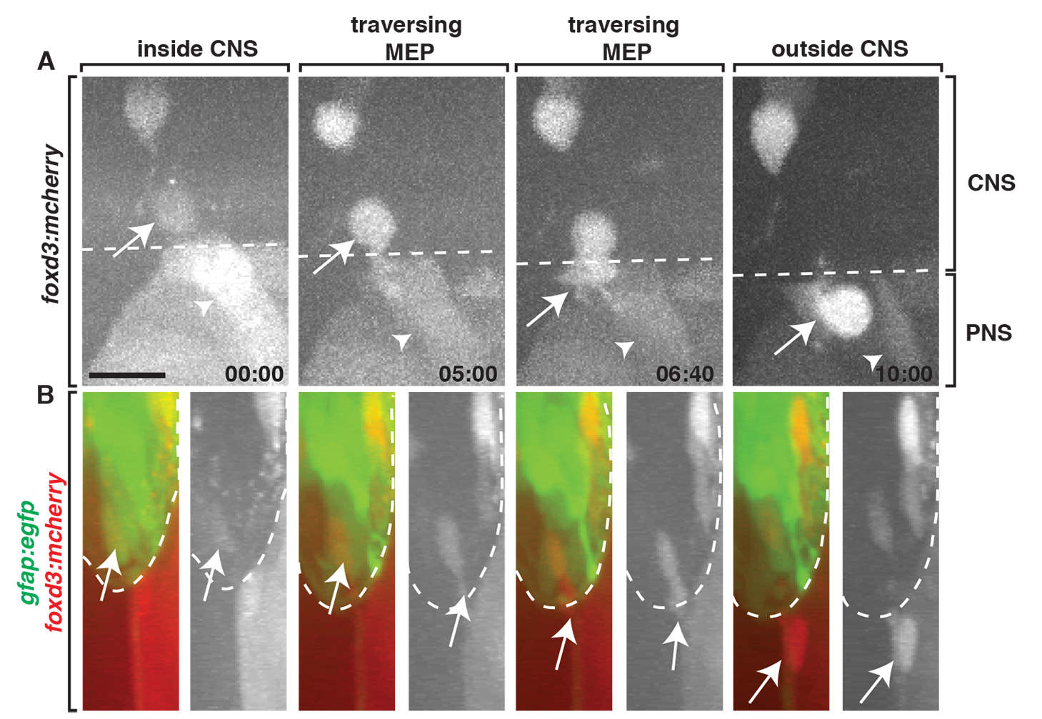 Frames captured from a 24-h time-lapse video of a Gt(foxd3:mcherry) transgenic embryo showed a foxd3+ cell (arrow) located inside the spinal cord (dotted line), migrate ventrally, exit the spinal cord at the MEP, and associate with a spinal motor root axon. The neural crest-derived population (arrowhead) is posterior to the CNS-derived cell. (B) Frames captured from the above video of a Tg(gfap:egfp);Gt(foxd3:mcherry) embryo rotated 90 degrees showed a foxd3+ cell starts inside the spinal cord, as marked by gfap+ endfeet along the lateral edge of the cord, then migrates through the TZ, and associates with spinal root axons in the PNS. Scale bar, 25 µm.