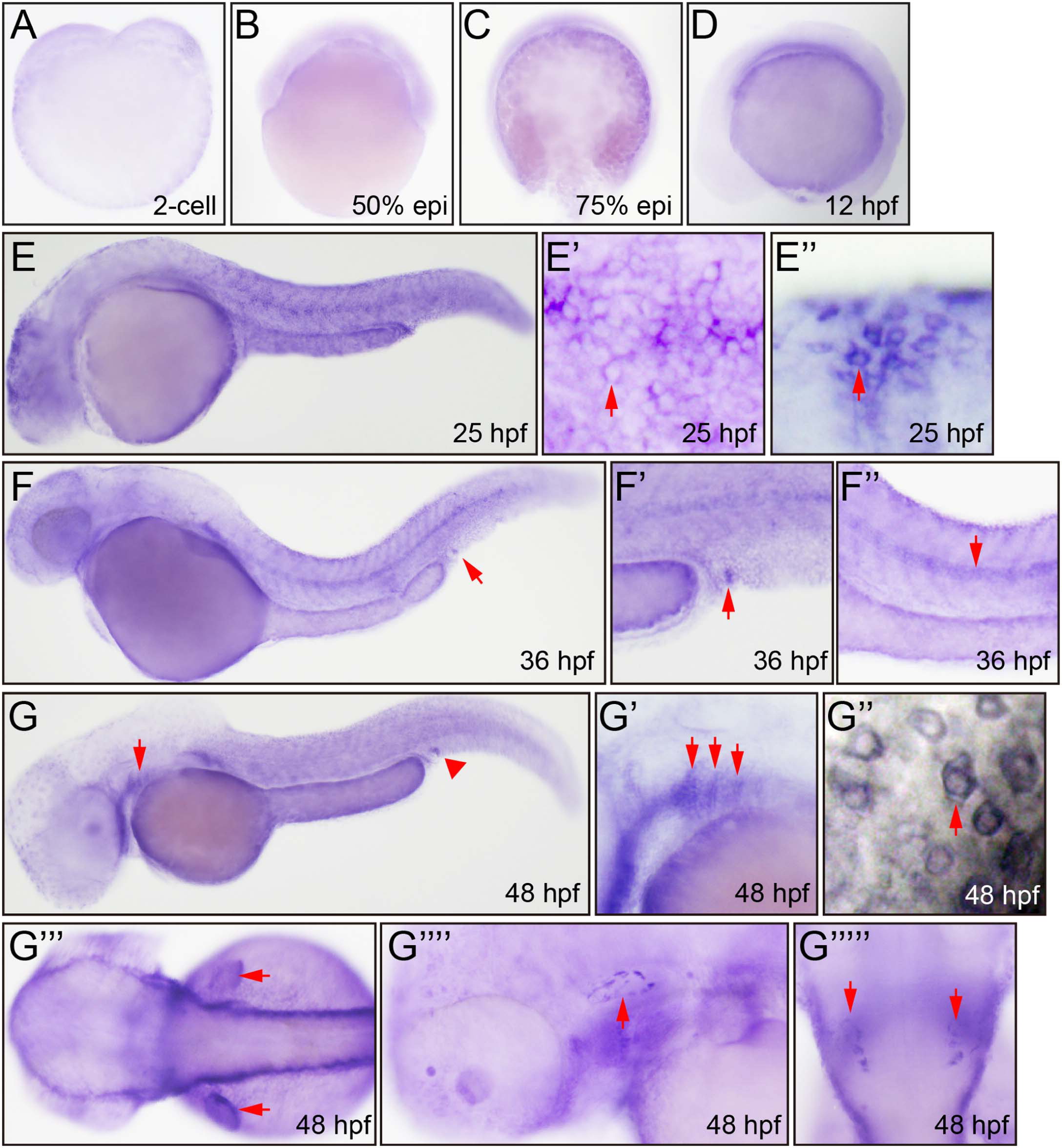 Whole mount in situ hybridization analysis of zebrafish embryos using antisense itgb1b.2 probe. A. 2-cell, lateral view. B. 50% epiboly, lateral view. C. 75% epiboly, lateral view. D. 12 hpf, lateral view, slightly staining of epidermis. E. 25 hpf, lateral view, epidermis. E′. 25 hpf, lateral view, caudal trunk EVL (arrow). E″. 25 hpf, lateral view, head EVL (arrow). F. 36 hpf, lateral view, urogenital opening (arrow). F′. 36 hpf, urogenital opening (arrow). F″. 36 hpf, lateral view, notochord (arrow). G. 48 hpf, lateral view, branchial arches (arrow), urogenital opening (arrowhead). G′. 48 hpf, lateral view, branchial arches (arrow). G″. 48 hpf, ventral view, head epidermis, EVL (arrow). G‴. 48 hpf, lateral view, pectoral fin epidermis (arrow). G″″. 48 hpf, lateral view, otic vesicle (arrow). G″‴. 48 hpf, dorsal view, otic vesicle (arrow).