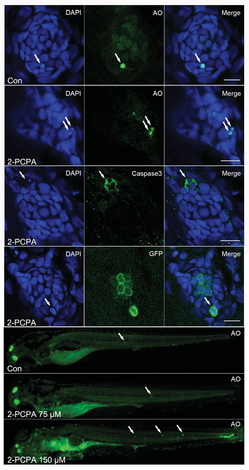 High concentration of 2-PCPA treatment leads to apoptosis. (A-E) 2-PCPA treatment at high concentration (150 µM) induced an enhancement of cellular apoptosis within neuromasts. A-B: AO staining in the neuromast of a control (A) and a 2-PCPA treated larva (B) at 5 dpf. White arrows indicated AOpositive cells. (C) Cleaved Caspase-3 staining in the neuromast of a 150 µM 2-PCPA treated larva at 5 dpf. (D) The detection of hair cell death in neuromast. Neuromast images from brn3c:mGFP larvae treated with 150 µM 2-PCPA. White arrows in (D) showed dying hair cells being extruded from the neuromast. Scale bar =10 µm. (E) 150 µM 2-PCPA treated larva (lower panel) have high levels of acridine orange (AO) staining (white arrows) in neuromasts, compared with control (upper panel) and 75 µM 2-PCPA treated larva (middle panel) at 5 dpf.