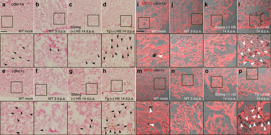 (a–h) RNAscope in situ hybridization analysis with cdkn1a (a–d) and cdkn1c (e–h) probes on frozen sections of uninjured wild-type (WT) hearts (a,e), injured WT hearts at 3 d.p.a. (b,f), injured WT sibling hearts at 14 d.p.a. (c,g) and injured Tg(hsp70:dn-xBrg1) transgenic hearts at 14 d.p.a. (d,h). Note the robust induction of cdkn1a (d) and cdkn1c (h) induction in Tg(hsp70:dn-xBrg1) transgenic hearts compared with WT sibling hearts at 14 d.p.a. after heat shock. Black arrowheads indicate the cdkn1a or cdkn1c signals. The panels below a–h are higher-magnification images of areas in squares of a–h. (i–p) Bright-field images of cdkn1a (i–l) and cdkn1c (m–p) expression by RNAscope merged with immunostaining signal images of MF20 on frozen sections of uninjured WT hearts (i,m), injured WT hearts at 3 d.p.a. (j,n), injured WT sibling hearts at 14 d.p.a. (k,o) and injured Tg(hsp70:dn-xbrg1) transgenic hearts at 14 d.p.a. (i,p). Higher-magnification images of squared areas of i–p are shown below their respective panels. Note that both cdkn1a (i) and cdkn1c (m) are normally expressed in cardiomyocytes in uninjured WT hearts, and that they are highly induced in MF20-positive cardiomyocytes of Tg(hsp70:dn-xBrg1) transgenic hearts (l,p) compared with WT sibling hearts (k,o) at 14 d.p.a. White arrowheads show cdkn1a or cdkn1c signals in cardiomyocytes. Tg, Tg(hsp70:dn-xBrg1); (+) HS, heat shock; Scale bars, 100 μm.
