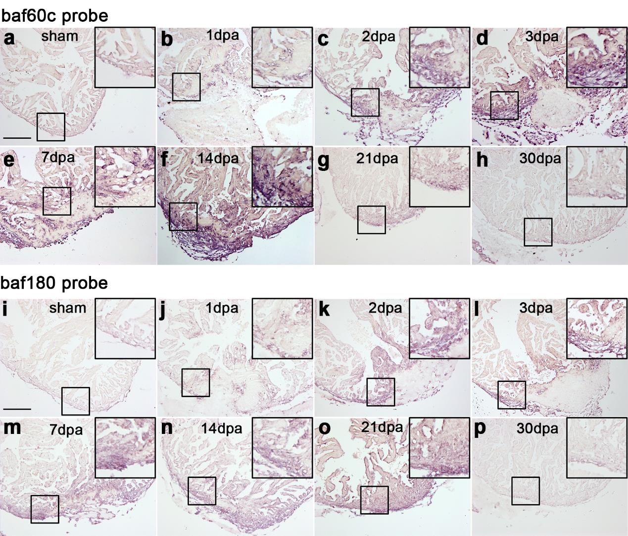 Baf60c and baf180 are induced during cardiac regeneration in zebrafish. RNA in situ hybridization was performed on paraffin sections from sham-operated adult hearts (a and i) and those with amputated ventricular apices from 1 to 30 dpa (b-h and j-p) with digoxigenin-labeled baf60c probe (a-h) or baf180 probe (i-p). Higher-magnification images of areas in squares were shown in the upper-right corners of panels a-p. Scale bars, 100 μm. Representative data from 3 independent experiments (n=5 hearts).