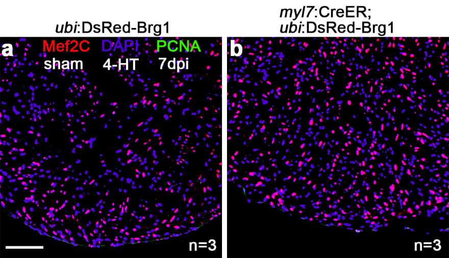 Cardiomyocyte-specific overexpression of brg1 is not sufficient to induce myocyte proliferation. PCNA+/Mef2C+ proliferating cardiomyocytes were not increased in uninjured Tg(myl7:CreER; ubi:loxP-DsRed-STOP-loxP-Brg1) transgenic hearts (b) compared with uninjured control Tg(ubi:loxP-DsRed-STOP-loxP-Brg1) hearts (a). Hearts were induced by tamoxifen for 24hr, and 7 days post inducement paraffin heart sections were costained for PCNA (green), Mef2C (red) and DAPI (purple). n=3; Scale bar, 100μm.