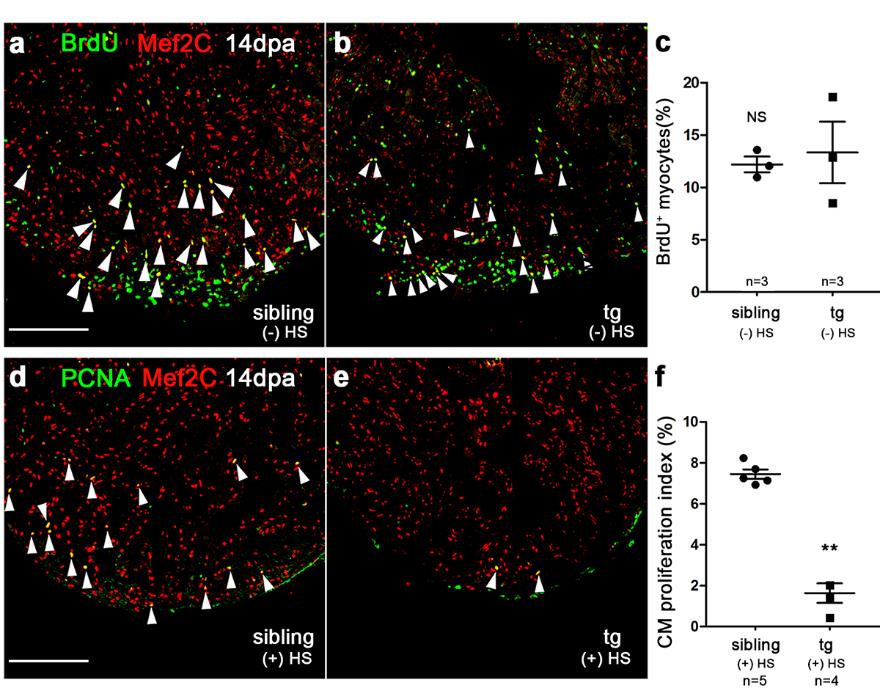 Inhibition of brg1 impairs cardiac regeneration. (a-c) BrdU+/Mef2C+ proliferating cardiomyocyte were comparable between wt sibling hearts (a) and dn-xBrg1 transgenic hearts (b) at 14 dpa without heat shock treatment [(-) HS]. (c) Percentages of BrdU+/Mef2C+ cardiomyocytes in the injured area. (d-f) PCNA+/ Mef2C+ proliferating cardiomyocytes (arrowheads) decreased in dn-xBrg1 tg hearts (e) compared with wt sibling hearts (d) at 14 dpa with heat shock treatment. (f) Quantification of cardiomyocyte proliferation assessed by PCNA+/ Mef2C+ staining Scale bars, 100 μm. Data presented are mean ± s.e.m.; paired Student’s t-test, sample numbers are listed under each group, ** p < 0.01.