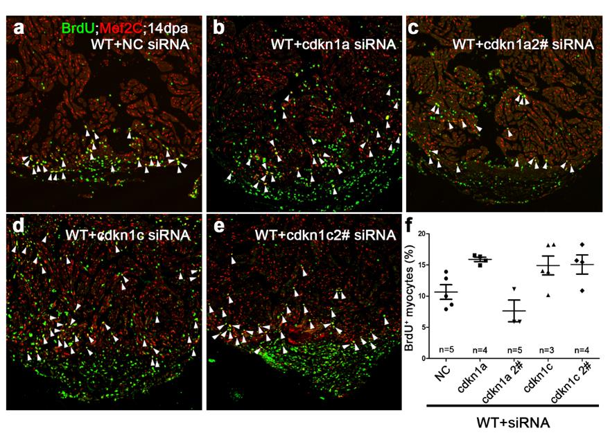 Knockdown of CDK inhibitors in wild-type hearts had minimal effects on myocardial proliferation. BrdU+/Mef2C+ proliferating cardiomyocytes (white arrowheads) were comparable among negative control (NC) siRNA (a), cdkn1a siRNA (b), cdkn1a 2# siRNA (c), cdkn1c siRNA (d), or cdkn1c 2# siRNA-treated (e) wild-type hearts at 14 dpa, consistent with low-level of cdkn1a and cdkn1c in wild-type injured hearts. (f) Statistics of panels a-e. The number (n) of hearts analyzed in each group is indicated in each group. Scale bar, 100μm.