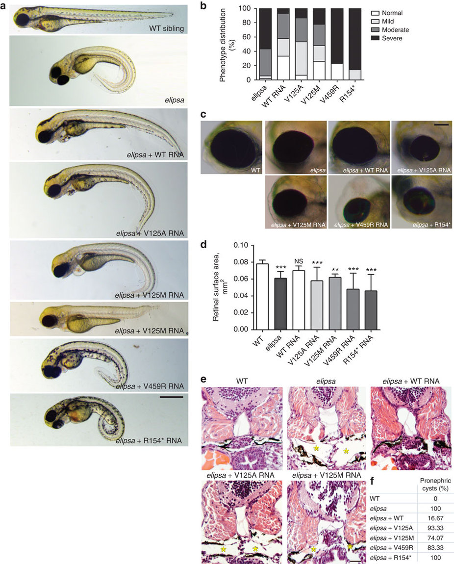 (a) Lateral views of zebrafish larvae at 72 hpf of WT control, elipsa uninjected larvae and elipsa larvae injected with WT or mutant RNA constructs (p.R154* and p.V459R correspond to the human p.R155* and p.M520R mutations, respectively). Approximately 20% of V125M-injected elipsa larvae displayed an alternative stunted phenotype with pronephric cysts and eye defects, but lacking the characteristic body axis curvature. Scale bar, 0.5 mm. (b) Phenotype distribution as determined by quantification of angle of body axis curvature (n≥30, 4 independent experiments). (c) Eye phenotypes (5 dpf) of WT control, elipsa uninjected larvae and elipsa larvae injected with WT/mutant RNA constructs, lateral views, anterior to the left. Scale bar, 0.1 mm. (d) Surface area of the retina (mean ± s.d. of n=10, 2 independent experiments, *P=0.05, **P<0.01, and ***P<0.001, Dunnett’s multiple-comparison test). (e) H&E staining of histological cross sections of elipsa mutant larvae injected with WT or mutant RNA constructs at 72 hpf. Gross cystic dilations of the glomerular region extending to the pronephric tubule are indicated by asterisks. Scale bar, 20 μm. (f) Percentage of pronephric cysts in elipsa mutant larvae as well as rescued larvae (n≥30, 4 independent experiments).