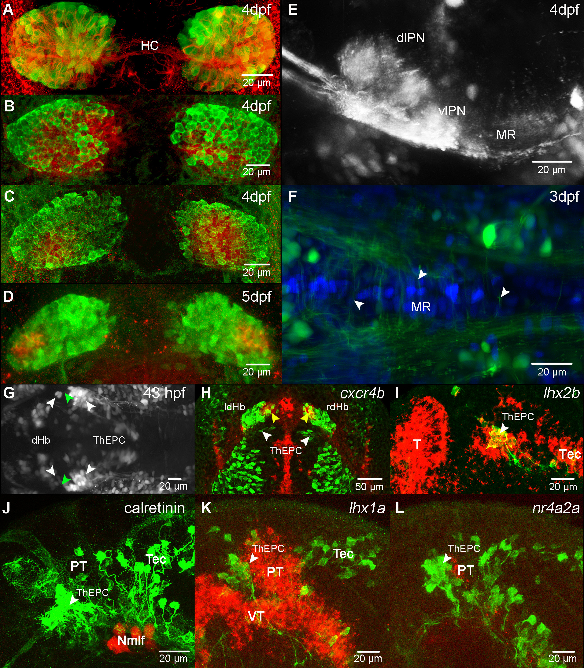 (A-D) Dorsal views, Maximum Intensity Projections (MIPs), anterior to the top, focussed on the habenular nuclei of Et(1.0otpa:mmGFP)hd1 transgenic embryos. GFP expression (green) overlaps with (A) acetylated tubulin, (B) kctd12.1, (C) kctd8 and (D) kisspeptin-1 (red). (E) Lateral view, anterior to the left, MIP. Habenular efferent projections innervating their targets in the ventral midbrain at 4 dpf in an Et(1.0otpa:mmGFP)hd1 embryo. (F) Dorsal view, anterior to the left, MIP. Axonal projections innervating the MR (arrowheads) in an 3 dpf Et(1.0otpa:mmGFP)hd1 embryo. Nuclei (blue) are labelled with H2A-CFP. (G) Dorsal view, anterior to the left, MIP. Et(1.0otpa:mmGFP)hd1 embryo showing the emergence of GFP in dHb cells. Anterior and posterior white arrowheads show the dHb and ThEPC cells respectively. Green arrowheads show early dHb efferent axons extending into the ThEPCs. (H) Dorsal view with anterior to the top, MIP, of a 52 hpf Et(-1.0otpa:mmGFP)hd1 embryo labelled with cxcr4b (red) expressed in dHb progenitor cells. Yellow arrowheads indicate the dHb region containing cxcr4b positive cells and transgenic GFP expressing cells. White arrowheads mark the ThEPCs. (I-L) Lateral views focussed on the thalamic area, MIPs of 32 hpf Et(- 1.0otpa:mmGFP)hd1 embryos co-labelled (red) with (I) the prosomere 2 (dorsal thalamus and epithalamus) marker lhx2b [S1, S2], (J) the calcium binding protein Calretinin expressed in the nucleus of the median longitudinal fascicle [S3] and (K, L) the pretectal markers lhx1a and nr4a2a [S4-S6]. Images were cropped and the gamma was adjusted for display purposes. d, dorsal; dHbl, lateral dorsal habenula; dHbm, medial dorsal habenula; dpf, days post fertilization; HC, habenular commissure; IPN, interpeduncular nucleus; l, left; MR, median raphe; Nmlf, nucleus of the medial longitudinal fascicle; PT, pretectum; r, right; T, telencephalon; Tec, optic tectum; ThEPC, thalamic-epithalamic early projecting cluster; v, ventral; VT, ventral thalamus.