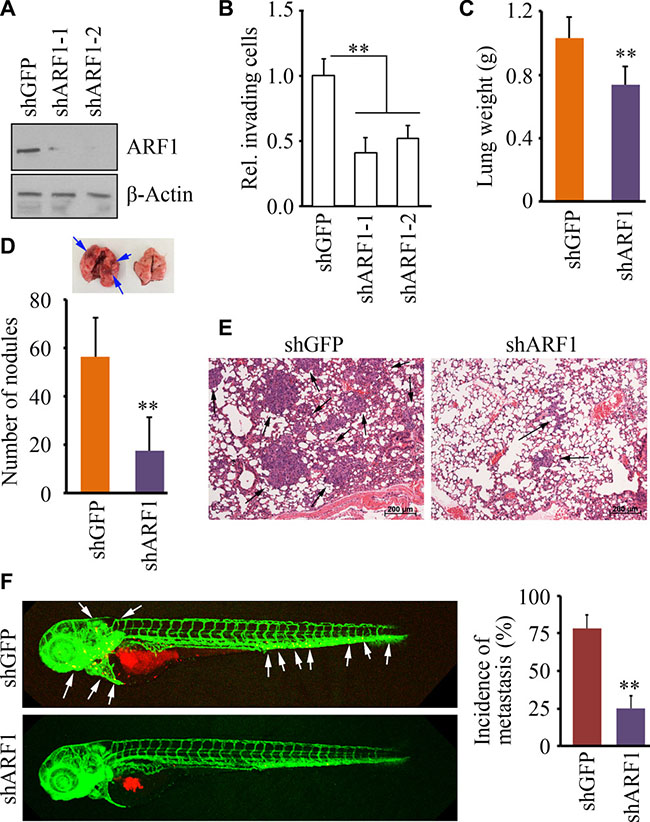 Knockdown of ARF1 leads to reduced cell invasion and metastasis in breast cancer. (A) The effect of shRNA-mediated ARF1 knockdown on MDA-MB-231 cells. (B) The effect of ARF1 depletion on cell invasion. (C, D, E, F) The effect of ARF1 depletion by shRNA on pulmonary metastases in the orthotopic mice model of breast cancer. (C, D) Quantitative data of lung weigh and gross surface pulmonary metastases. (E) Representative H&E stained lung sections from tumor-bearing mice. Six weeks after injection with MDA-MB-231 cells, the lungs from the NSG mice sacrificed were excised for pathological and histological analysis. Black arrows indicate representative metastatic foci. (F) The effect of ARF1 depletion by shRNA on metastatic dissemination in zebrafish. White arrows indicate disseminated MDA-MB-231 cells in the fish body. Quantitative data are shown in right panel. **p < 0.01.