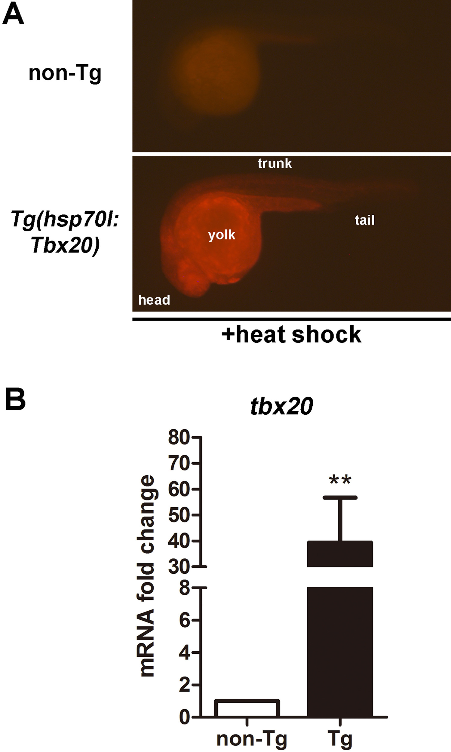 Tbx20 overexpression in the Tg(hsp70l:Tbx20) line. (A) mCherry fluorescence was observed in hsp70l:Tbx20 embryos after heat shock. The head, trunk, tail and yolk domains of the embryo are labeled. (B) Quantitative RT-PCR analyses demonstrated an approximately 40-fold increase in tbx20 expression hsp70l:Tbx20 embryos after heat shock.