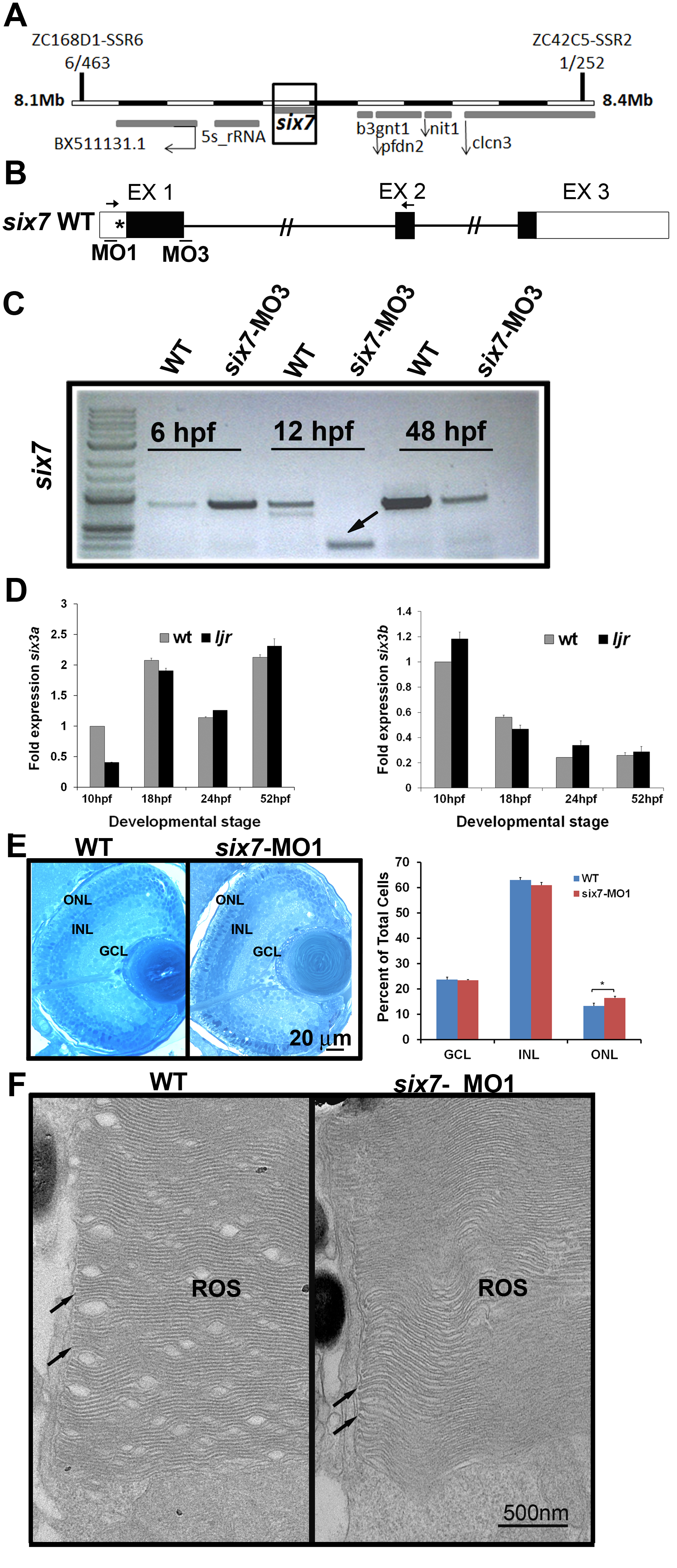 (A) Linkage analysis places the ljrp23ahub locus on chromosome 7, 6 out of 463 larvae show recombination at marker ZC168D1-SSR6 and 1 out of 252 larvae show recombination at marker ZC42C5-SSR2. (B) Diagram of predicted morpholino recognition sites (bars) in six7 loci. MO1 targets a translational site and MO3 blocks a donor splice site in intron 1 of six7. Incorrect splicing can be seen in morpholino-injected animals using primers in exon1 and 2 (arrows). (C) RT-PCR fragments, using primers highlighted in A, were analyzed by 1% agarose gel electrophoresis. Arrow highlights the six7 alternative spliced product obtained at 12 hpf (* indicates the new cryptic splice site). (D) No changes in the expression of the homologues six3a (left graph) or six3b (right graph) were detected between WT and ljrp23ahub mutants (n = 30 embryos per group). All the real-time PCR experiments were carried out in triplicates and normalized to β-actin. (E) Plastic sections of 4 dpf retinas from WT and six7-MO1 injected larvae. The three layers are regularly arranged in WT and morphant retinas. Close examination of the retina revealed a densely packed ONL in morphants. Graph showing the average number of nuclei per unit area (WT, n = 3, 2 sections each; six7-MO1, n = 3, 2 sections each). Cells are increased in the ONL of six7 morphants. Student t test, arcsine transformation, *p<0.05. (F) Electron micrographs of rod outer segments (ROS) from central retina of WT and six7-MO1 larvae. ROS from six7 morphants show their typical morphology of parallel- flattened sacs with continuously membranes at the edges (arrows) indistinguishable from WT ROS.