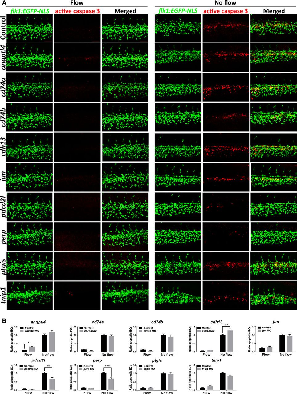 Zebrafish functional screening of putative apoptotic regulators. A, Zebrafish embryos (flk1:EGFP-NLS embryos; green endothelial cell [EC] nuclei) were injected with morpholinos oligonucleotides (MOs) targeting candidate genes or a nontargeting control MO (indicated on the left of each row). EC apoptosis was studied in the presence (control MO) or in the absence (sih MO) of flow by whole-mount active caspase-3 staining (red). Apoptotic ECs (yellow) were monitored at 30 hours post fertilization (hpf). Lateral view, anterior to the left, dorsal up. Scale bar: 50 μm. B, The proportion of apoptotic ECs (number of apoptotic ECs divided by the total number of ECs) normalized to sih MO-injected embryos was calculated, and mean values are shown with SEM. n≥15 from 3 independent experiments. *P<0.05, **P<0.01, ***P<0.001 using 1-way ANOVA.