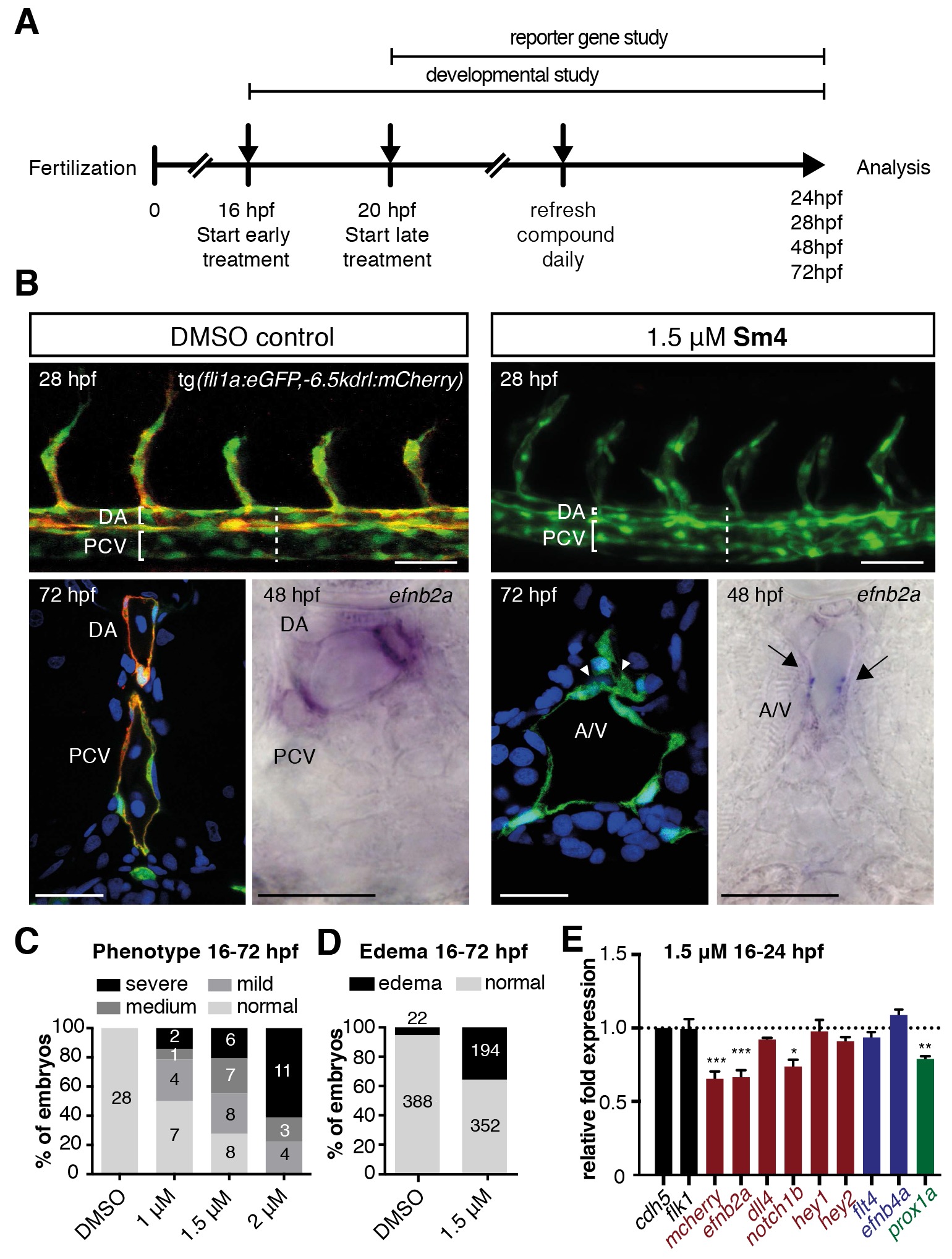 (A) Timeline of Sm4 treatment in zebrafish larvae. Treatment for SOXF reporter gene studies was initiated at 20 hpf, while for the phenotypic studies treatment was initiated at precedes that for, to act during the right developmental window for arteriovenous specification. (B) Lateral view and transverse section of the trunk region of DMSO control and Sm4-treated tg(fli1:eGFP,−6.5kdrl:mCherry) larvae. Control DMSO larvae formed a distinctly separated dorsal aorta (DA) and posterior cardinal vein (PCV). In Sm4-treated larvae, the DA was constricted and/or fused to the PCV (arrowheads). Whole mount in situ hybridization against arterial marker efnb2a shows reduced expression and compromised formation of the DA and in Sm4-treated larvae at 48 hpf (arrows). Sections were DAPI stained (in blue). Scale bar brightfield: 0.5 mm, fluorescent and in situ 25 μm. (C) Concentration dependent effect of Sm4, showing quantitation for predominant phenotype at 72 hpf: mild (tail curvature), medium (dilation of the PCV) or severe (arteriovenous defect and/or circulation defect). Indicated timeframe refers to Sm4 treatment window and endpoint. (D) Quantitation of cardiac edema frequency in larvae treated with Sm4 (1.5 μM). (E) qRT-PCR analysis of Sox18 dependent −6.5kdrl:mCherry and endogenous endothelial transcript levels in Sm4-treated larvae relative to DMSO control (dotted line), showing effect on arterial and venous markers at 24 hpf. All expression levels were normalized to expression of endothelial marker cdh5. Data shown are mean ± s.e.m. *p<0.05, **p<0.01, ***p<0.001.