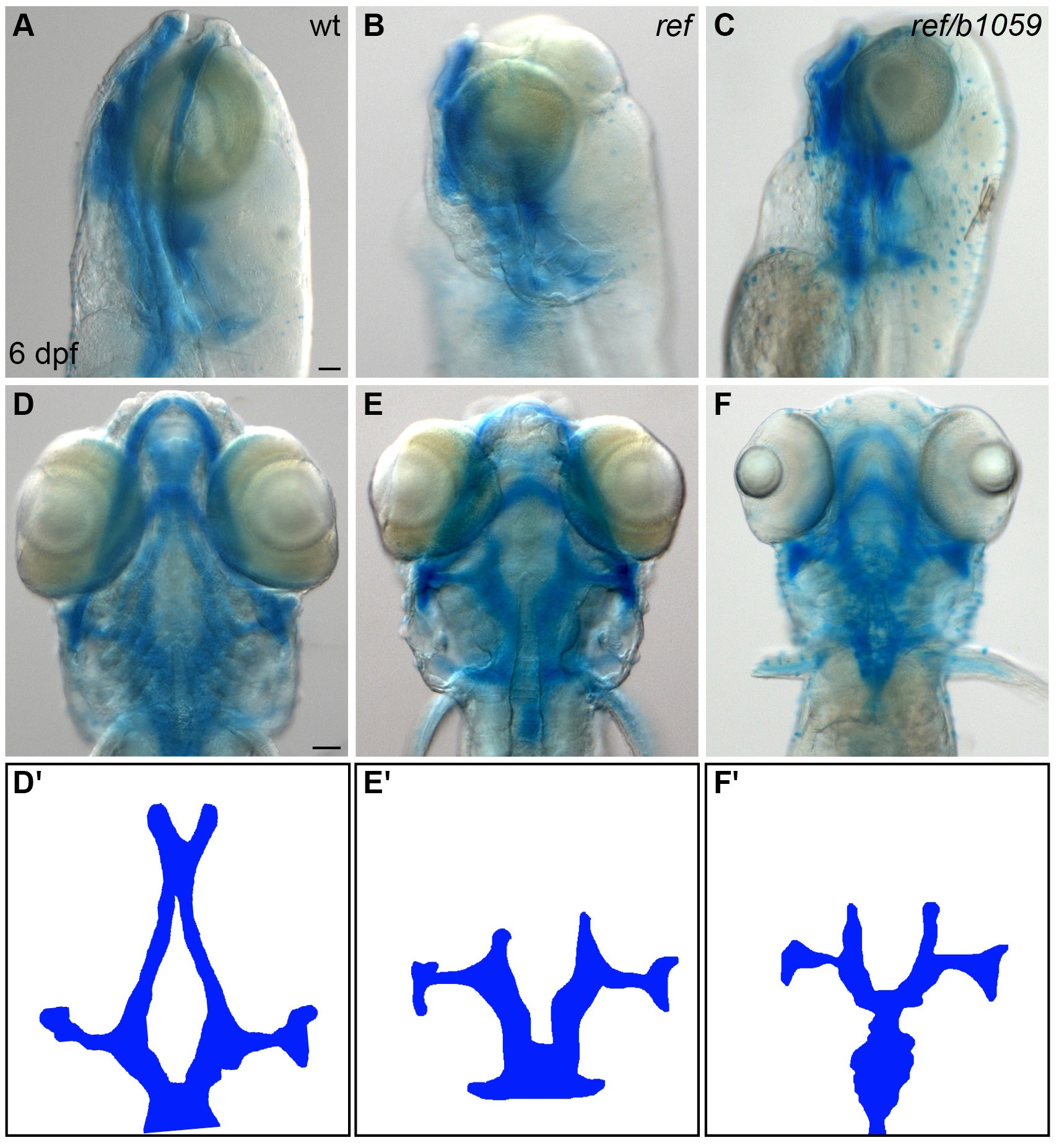 (A–F) Lateral (A–C) and ventral (D–F) views of embryos at 6 days post-fertilization (dpf), stained with Alcian blue to show the dorsal and ventral cartilage in the head. Embryos homozygous for ref (B,E; n = 9/9) or transheterozgous for ref and b1059 (C,F; n = 5/6) display similar dorsal cartilage formation defects. Specifically, the dorsal ethmoid plate is diminished or absent in these mutants. Scale bars: 60 μm. (D'–F') Cartoons illustrate the dorsal cartilage structures shown in D–F.