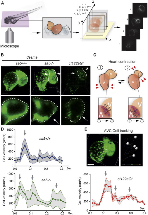 (D) Graph representing the velocity of myocardial cell motion in the AVC region following 3D cell tracking in desmasa5+/+, desmasa5−/−, and ct122aGt.