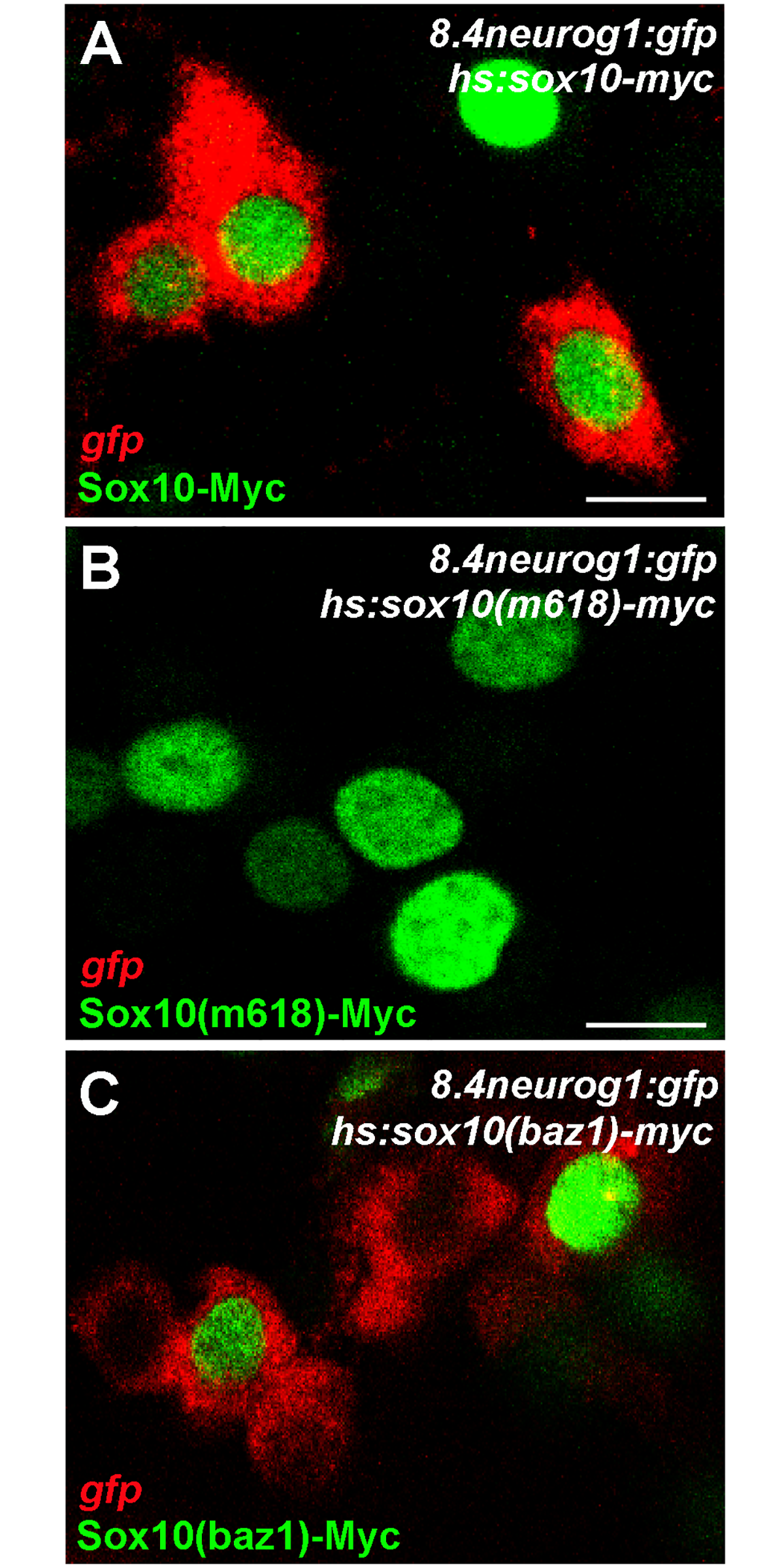 Tg(8.4neurog1:GFP) embryos were injected with expression plasmids encoding variants of Sox10. Embryos were heat-shocked at 7 hpf and fixed at 10 hpf. Expression of the Sox10 variant proteins was detected by immunofluorescent detection of their Myc tags (green) and activation of the neurog1 reporter gene is seen by In situ hybridisation against the gfp mRNA (red). Note how both WT and baz1 proteins activate Tg(8.4neurog1:GFP) reporter expression (A C), whereas m618 does not (B). Apparent non-autonomous activation of gfp after expression of Sox10(baz1) but not Sox10(WT) nor Sox10(m618) was reproducibly seen, but always restricted to cells adjacent to those expressing Sox10(baz1); the mechanism underlying this remains unclear but could be related to differential stability of the various Sox10 proteins.