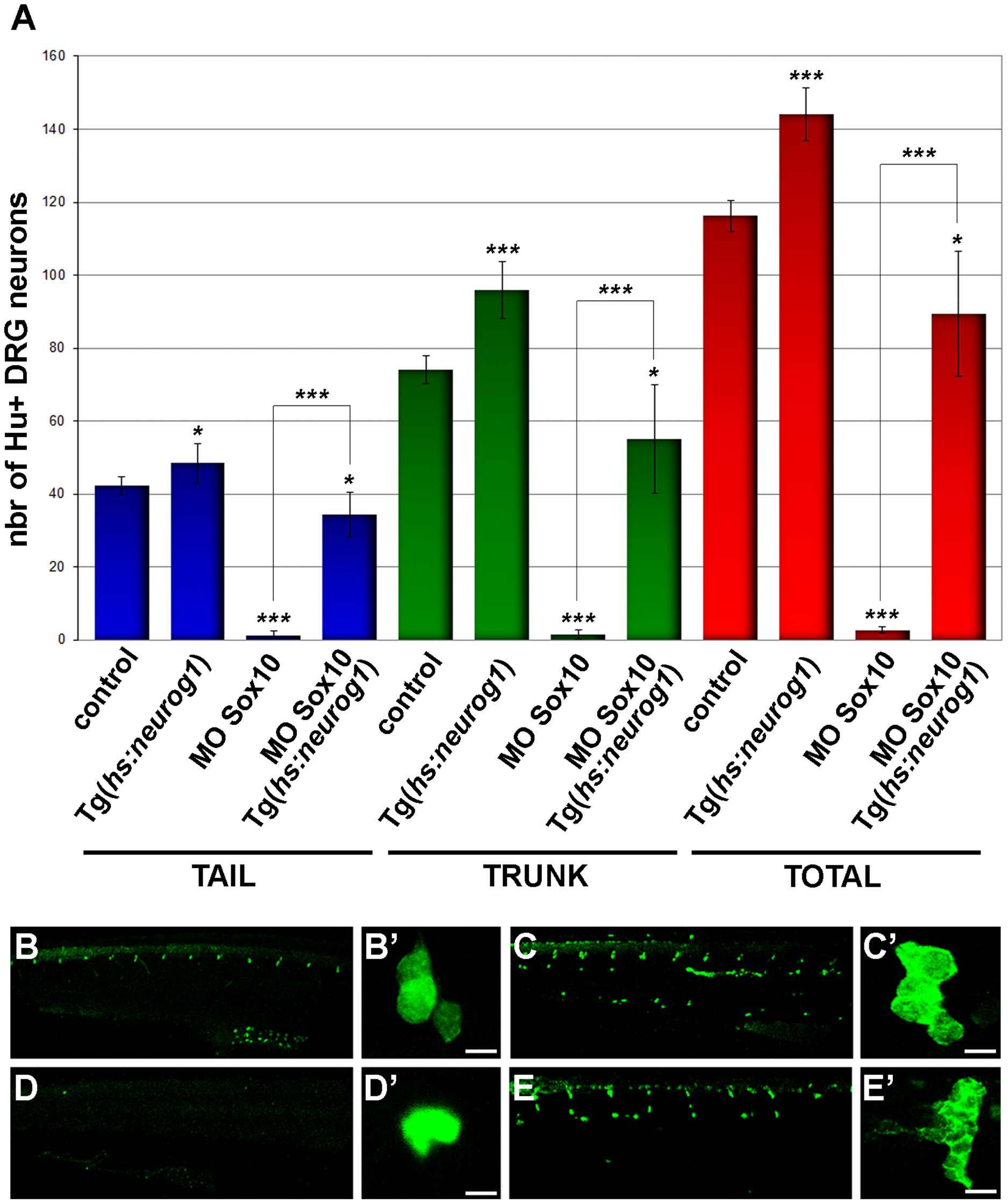 (A) Quantification of mean (±s.d.) total numbers of Elav1/Hu+ DRG neurons in tail (blue), trunk (green) or total (red). The number of embryos analysed was 6 (WT control), 6 (hs:ngn1), 8 (MO sox10) and 7 (MO sox10, hs:ngn1). Significance of differences as determined by two-tailed Student’s t test comparisons is indicated by * (p<0.05), ** (p<0.001) and *** (p<0.0005). Control (B-C’) or sox10-morpholino injected (D-E’) embryos were left uninduced (B,B’,D,D’) or subjected to heat-shock (C,C’,E,E’) and subsequently processed for Elav1/Hu immunofluorescence at 5 dpf; embryos were heat-shocked at 28hpf for 1 hour. Panels show lateral views of trunk (B,C,D,E) and close-ups of representative DRGs (B’,C’,D’,E’).