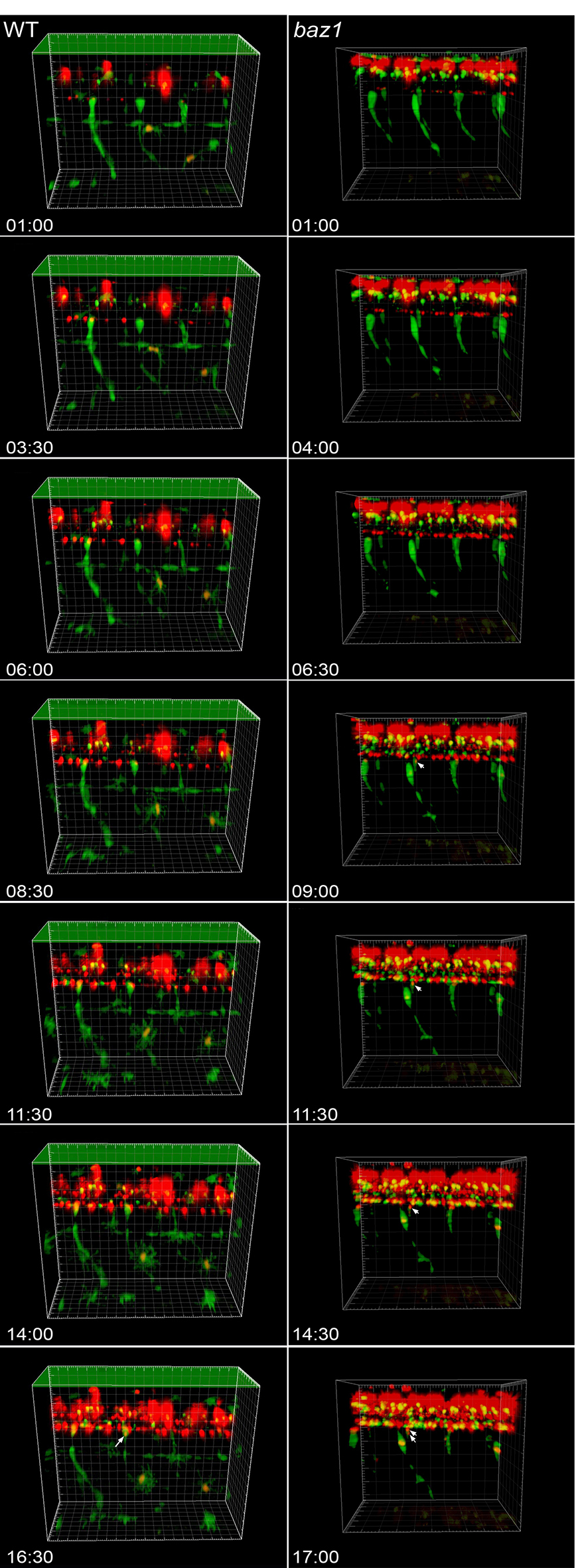 Extracted frames from S1 video (WT, left) and S2 video (baz1, right) of 4 segments of trunk of Tg(-4.9sox10:eGFP)ba2; Tg(neurog1(-8.4)):nRFP). Arrows indicate subset of DRG neurons (nRFP+). Time since timelapse initiated indicated in Hrs;Mins.