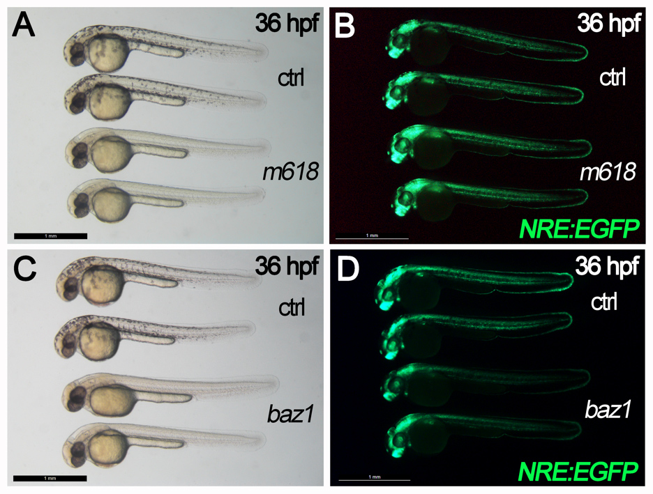 A-D) bright field (A,C) and fluorescent (B,D) views of control (ctrl) and mutant (m618, baz1) embryos in Notch reporter (NRE:EGFP) transgenic background. m618 embryos and their controls do not show dramatic differences in Notch reporter activation, while baz1 mutants exhibit decreased fluorescent signals compared to controls. All panels display 36 hpf embryos in lateral view, anterior to the left. Scale bar: 1 mm.