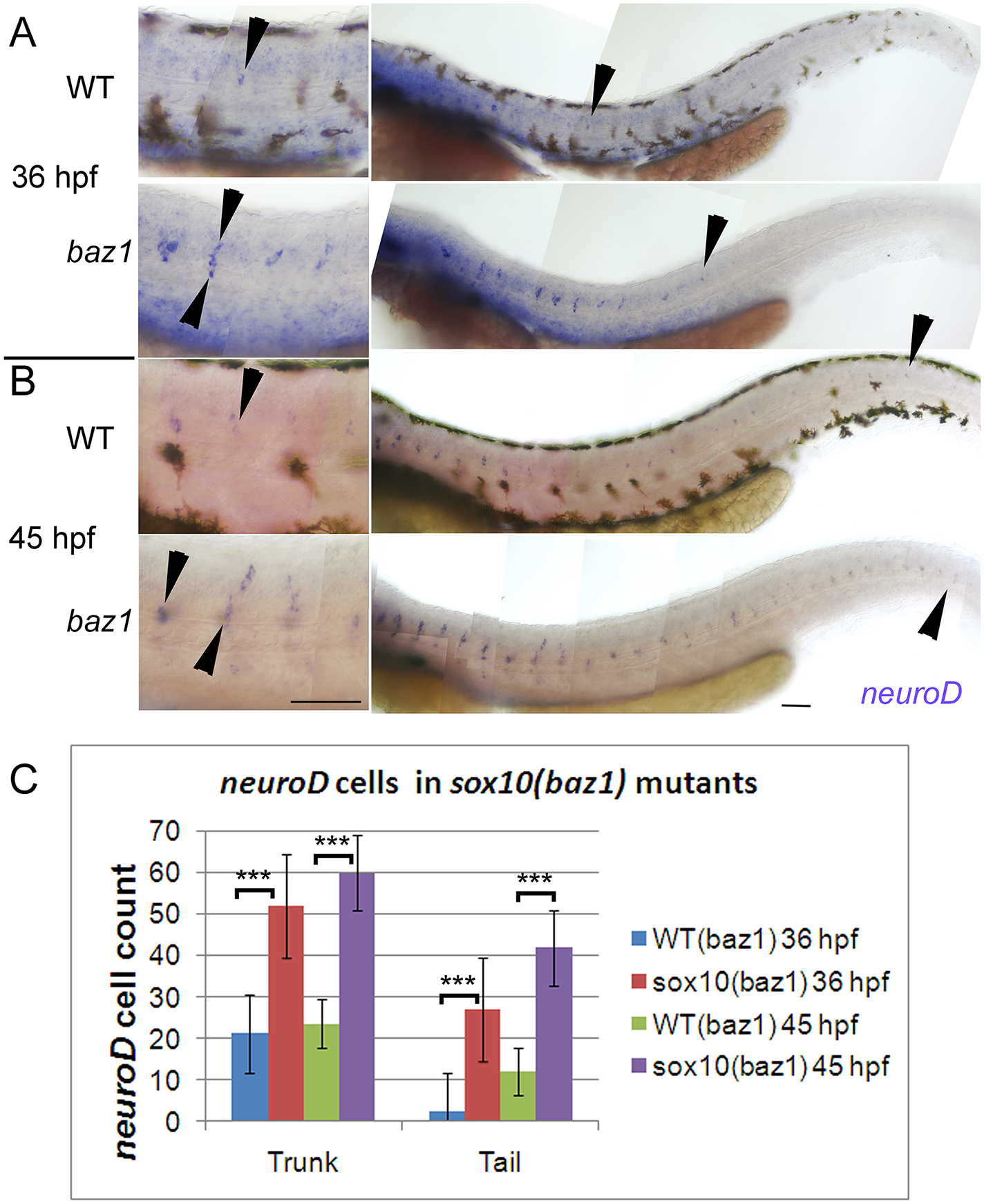 A,B) neurod1 expression is seen in more cells (close-ups in left panels; arrowheads indicate a subset of neurod1+ cells) and extending more posteriorly (right panels; arrowhead marks posteriormost neurod1+ DRG) in baz1 mutants compared with WT siblings at both 36 and 45 hpf. C) Counts of neurod1+ cells on one side of embryo at 36 and 45 hpf embryos (N = 11 for all conditions except 36 hpf baz1, where N = 13). baz1 mutants significantly different to WT siblings (Student’s t test; ***, p<0.0001. In this and all subsequent images, embryos are shown in lateral view with dorsal to the top and anterior to the left, unless otherwise stated. Scale bar, 100 μm.