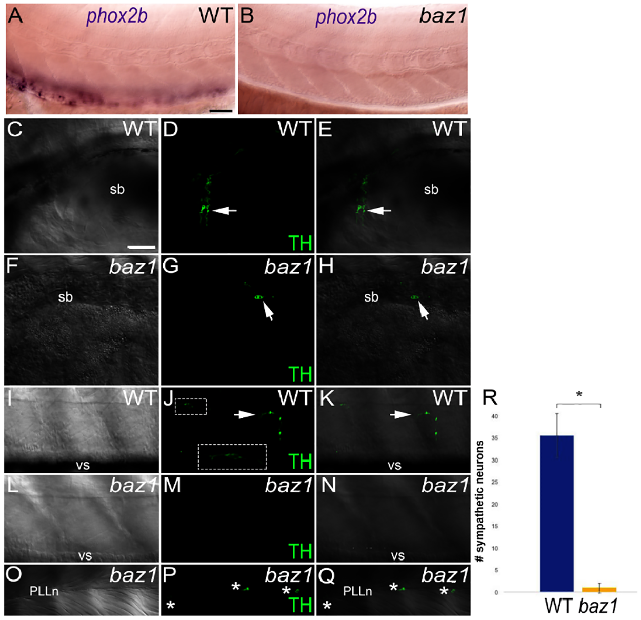 A,B) phox2b expression at 72 hpf in wild-types (A) is restricted to the enteric neuron progenitors, but is absent from baz1 embryos (B). Tyrosine hydroxylase (TH) immunofluorescence reveals differentiated sympathetic neurons at 7 dpf in WT (C-E, I-K), whereas these are much reduced in baz1 mutants (F-H, L-M). White arrows indicate a subset of TH+ neurons. Inset in J represents enlargement of boxed area to show autonomic neuron chain more clearly. Occasional baz1 mutants show anti-TH immunofluorescence in neurons (*) associated with the PLLn (O-Q). DIC (C,F,I,L,O) and immunofluorescent TH images (D,G,J,M,P) are merged in panels E,H,K,N,Q respectively. sb, swim bladder; vs, ventral stripe. R) Quantitation (mean ± s.d.) of anti-TH positive sympathetic neurons in WT (N = 16) and baz1 mutants (N = 16). * indicates significant difference (two-tailed t test, p<0.001) Scale bar, 50 μm(C).