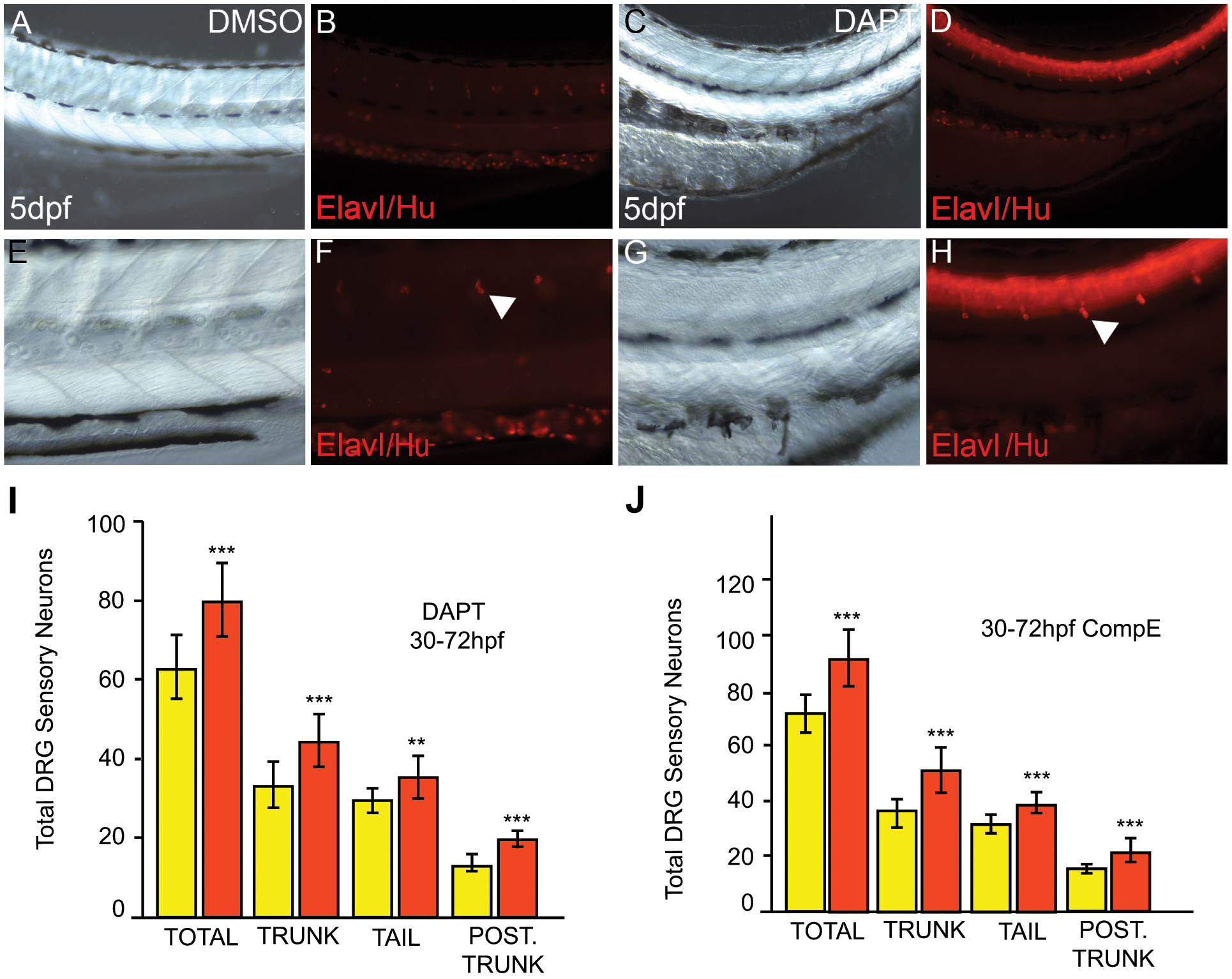 A-H) Posterior trunks of WT embryos treated with 100 μM DAPT from 30–72 hpf (C,D,G,H) and controls exposed to DMSO carrier alone (A,B,E,F). E-F show enlargements of A-D. Treated embryos show dorsally-curved body axis (C). Immunofluorescence for Elav1/Hu revealed increased numbers of DRG sensory neurons (arrowhead). I,J) Quantitation of DRG sensory neurons in 5 dpf embryos after treatment with 100 μM DAPT (I, orange) or 100 μM Compound E (J, orange) from 30–72 hpf; compared with control DMSO-treated embryos (yellow in I and J), sensory neuron numbers are significantly increased (***) when Notch signaling is inhibited. While trunk refers to the entire somitic region from posterior to the otic vesicle to the anus, tail refers to the post-anal body; posterior trunk refers to the 7 most posterior somatic segments dorsal to the yolk sac extension. N = 13 (Control, I), 13 (DAPT, I), 16 (Control DMSO, J) and 15 (Comp. E, J). Significance of elevated numbers of neurons was evaluated by two-tailed Student’s t test (**, p<0.01; ***, p<0.001).