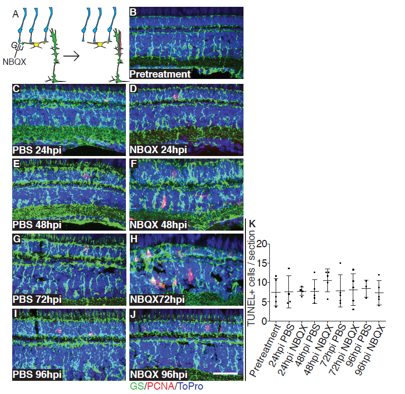 Model illustrating predicted effects of NBQX injections on MG proliferation (A). Eyes were injected with 25 nmol of NBQX or PBS and allowed to recover. Eyes were removed before injection (B) as well as at 24hpi (C, D), 48hpi (E, F), 72hpi (G (same as Figure 2B), H), or 96hpi (I, J) and proliferation assessed by PCNA staining. Scale bar is 100μm. Apoptosis was also measured before injection (n=5) and after PBS or NBQX injection at 24hpi (n=4, 4), 48hpi (n=5, 5), 72hpi (n=5, 5), and 96hpi (n=3, 5) by TUNEL (K). A one-way ANOVA was used; Error bars = SD.