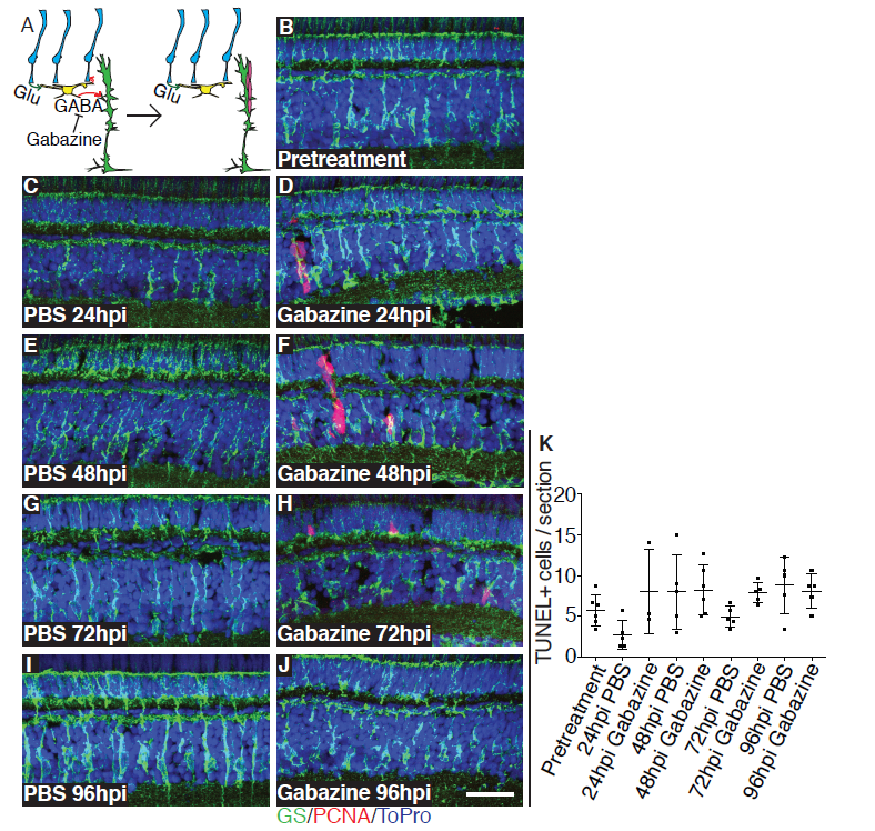 Model illustrating predicted effects of gabazine on MG proliferation (A). Eyes were injected with PBS or 12.5 nmol of gabazine and allowed to recover. Eyes were removed before injection (B) as well as at 24hpi (C,D), 48hpi (E (same as Figure 1B), F), 72hpi (G,H), or 96hpi (I,J) and proliferation assessed by PCNA staining. Scale bar is 100μm. Apoptosis was also measured before injection (n=6) and after PBS or gabazine injection at 24hpi (n=5, 3), 48hpi (n=5, 6), 72hpi (n=5, 5), and 96hpi (n=5, 5) by TUNEL (K). A one-way ANOVA was used; Error bars = SD.