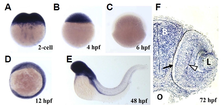 Whole-mount in situ hybridization was performed with DIG-labeled antisense RNA probe (hpf, hours after fertilization). (A) At 2-cell stage, maternal transcripts were detected in high density. (B) At dome stage (4 hpf), high level of transcription persisted. (C) At the beginning of gastrulation, shield stage (6 hpf), ranbp9 mRNA was hardly detected. (D) At 6-somite stage (12 hpf), ranbp9 was seen expressed ubiquitously. (E) At 48 hpf, ranbp9 expression was mainly observed in the head region. (F) Section of head region at 72 hpf, showing ranbp9 expression in the brain (B) and eye (L, lens). Its expression is more prominent in forming layers (arrow head) of the retina, compared to the periphery (arrow). O, oral cavity.