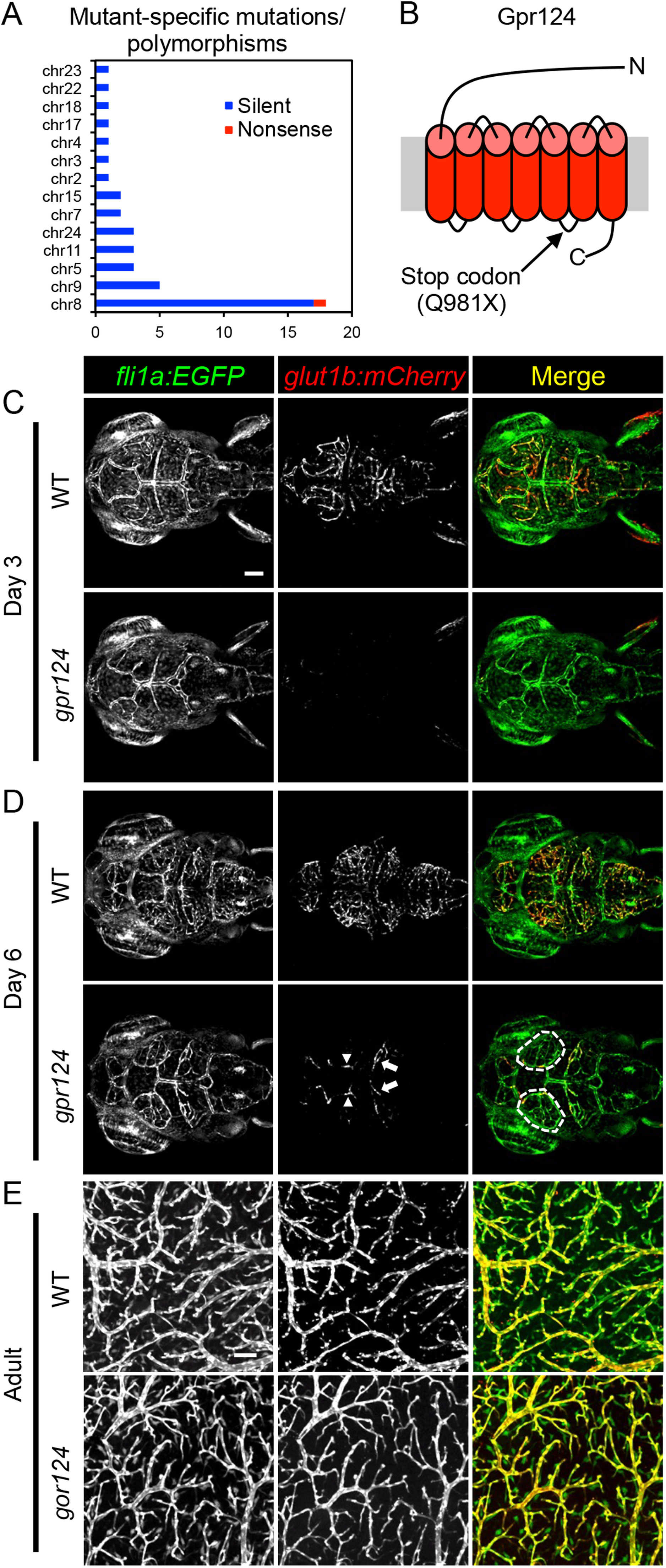 gpr124 mutants have reduced CNS angiogenesis. (A) Whole-exome sequencing was used to identify the gpr124 mutation. Only one gene on chromosome 8 was found to have a nonsense mutation. (B) A premature stop codon was found in gpr124 resulting in a Q981X mutation located in the intracellular loop between transmembrane domains 5 and 6 (not to scale). (C) At 3 dpf, gpr124 mutants show no CNS angiogenesis and no glut1b:mCherry expression (see Video 2). (D) At 6 dpf, gpr124 mutants form abnormal vessels on the brain surface between the mesencephalic vein and the eye (white dashed outline in Day 6 Merge and Supplemental Figure 1), CNS angiogenesis partially recovered where the mid-cerebral vein sprouts into the parenchyma, and few of these vessels begin to express glut1b:mCherry (arrows), including expression in the mesencephalic vein (arrowheads). The 3D distribution of brain vasculature can be seen more clearly in Video 2. (E) Confocal images of the optic tectum vasculature from wild type (WT) and gpr124 mutant adults at 3 months. Scale bar (C, top left image) is 50 µm for all images in (C) and (D). Scale bar is 100 µm (E, top left image).