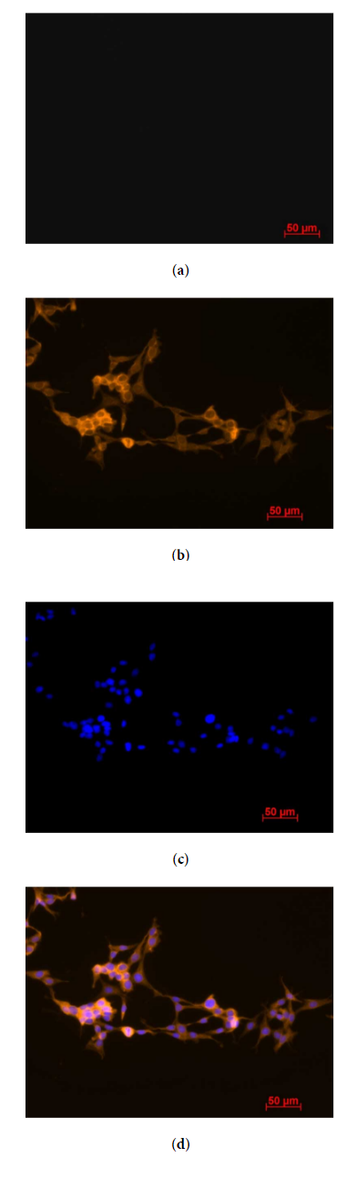 Evidence of Opn4m1 immunoreactivity in D. rerio ZEM-2S cells. (a) Control preparation in which the primary antibody was omitted; (b) Opn4m1 labeling revealed by Cy3-secondary antibody in orange showing the protein localization in the cell membrane; (c) DAPI-labeled nuclei in blue; (d) merged (b) and (c) images. Photomicrographies were taken with Axiocam MRm camera (Zeiss) and pseudocolored with Axiovision Software (Zeiss). Scale bar 50 µm (200x magnification).