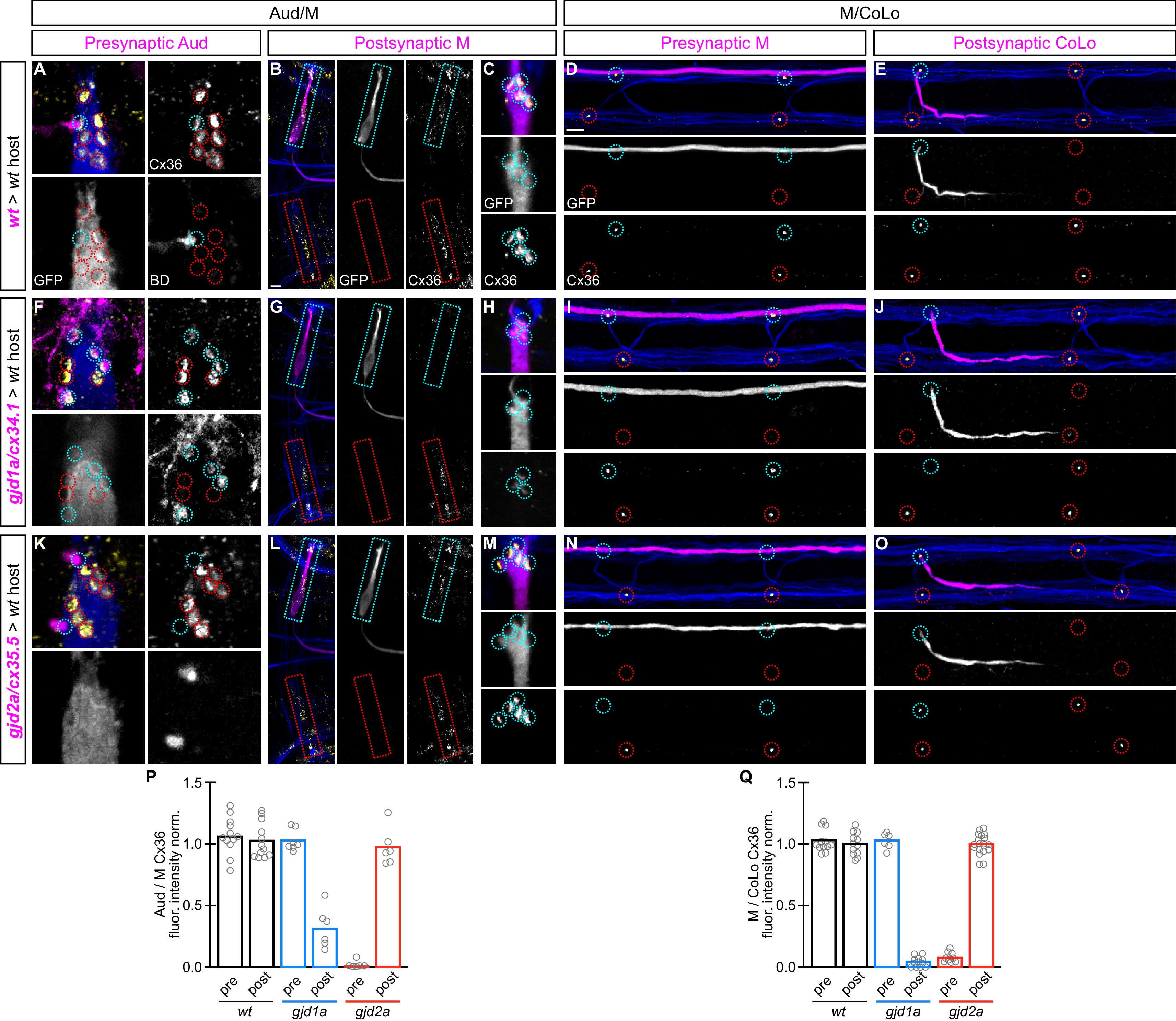 Dorsal views of chimeric larvae containing Biotin-Dextran- (BD) or GFP-marked cells transplanted from a donor embryo of noted genotype into a wildtype (wt) host; throughout the figure the neurons derived from the donor embryo are displayed in magenta, while those from the host are in blue. Synapses (stained with anti-human-Cx36, yellow) associated with a transplanted neuron (cyan circles and boxes) can be directly compared to wildtype host synapses (red circles and boxes). Hindbrain, lateral dendrite, and spinal cord images are maximum intensity projections of ~30,~5, and ~10 uM, respectively. Anterior is to the left. Scale bar = 10 uM. (A–C) At the Aud/M synapses presynaptic auditory afferent neurons (in A, stained with BD, magenta) synapse onto the postsynaptic Mauthner lateral dendrite (stained with anti-GFP, blue in A, magenta in B,C). (D,E) At the M/CoLo synapses the presynaptic Mauthner axon (stained with anti-GFP, magenta in D) synapses with the postsynaptic CoLo (stained with anti-GFP, magenta in E). (F–J) Presynaptic removal of gjd1a/cx34.1 function has no effect on Aud/M and M/CoLo synapses (cyan circles in F,I). By contrast, removing gjd1a/cx34.1 postsynaptically causes a loss of electrical synapse staining (cyan boxes and circles in G,H,J; note residual Cx36 staining at Aud/M synapses when gjd1a/cx34.1 is removed from only the postsynaptic neuron, (H). (K–O) Conversely, gjd2a/cx35.5 function is required exclusively presynaptically (K,N) and is dispensable postsynaptically (L,M,O). (P,Q) Quantitation of the ratio of Cx36 at donor-associated synapses to wildtype host synapses in chimaeric embryos. Each circle represents the average ratio of 1–8 donor-associated to 8–12 host-associated synapses within an animal, varying depending on the synapse and chimaera. Associated quantitation of Cx36 at chimeric synapses can be found in Figure 6—source data 1 for Figure 6 and Figure 6—source data 2 for Figure 6.